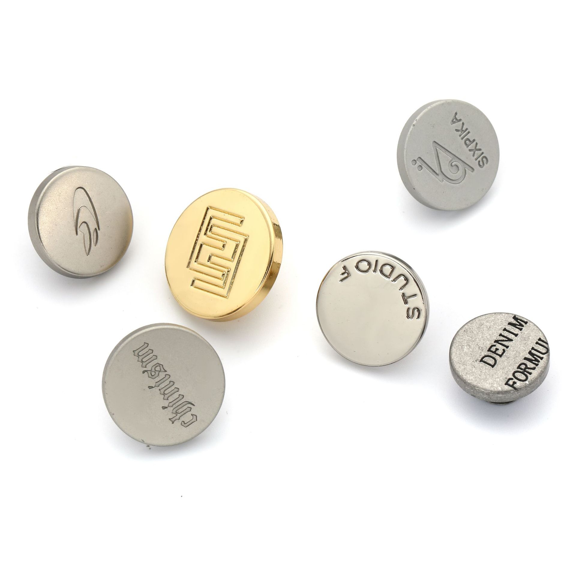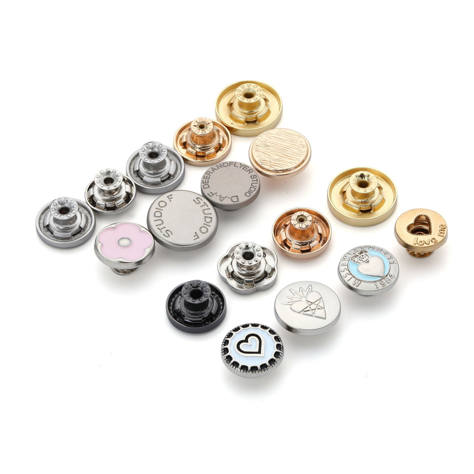 Zinc alloy flat bottom, no nail required, detachable metal buttons. Adjustable size metal waist cinching cuff buttons for clothing jackets.