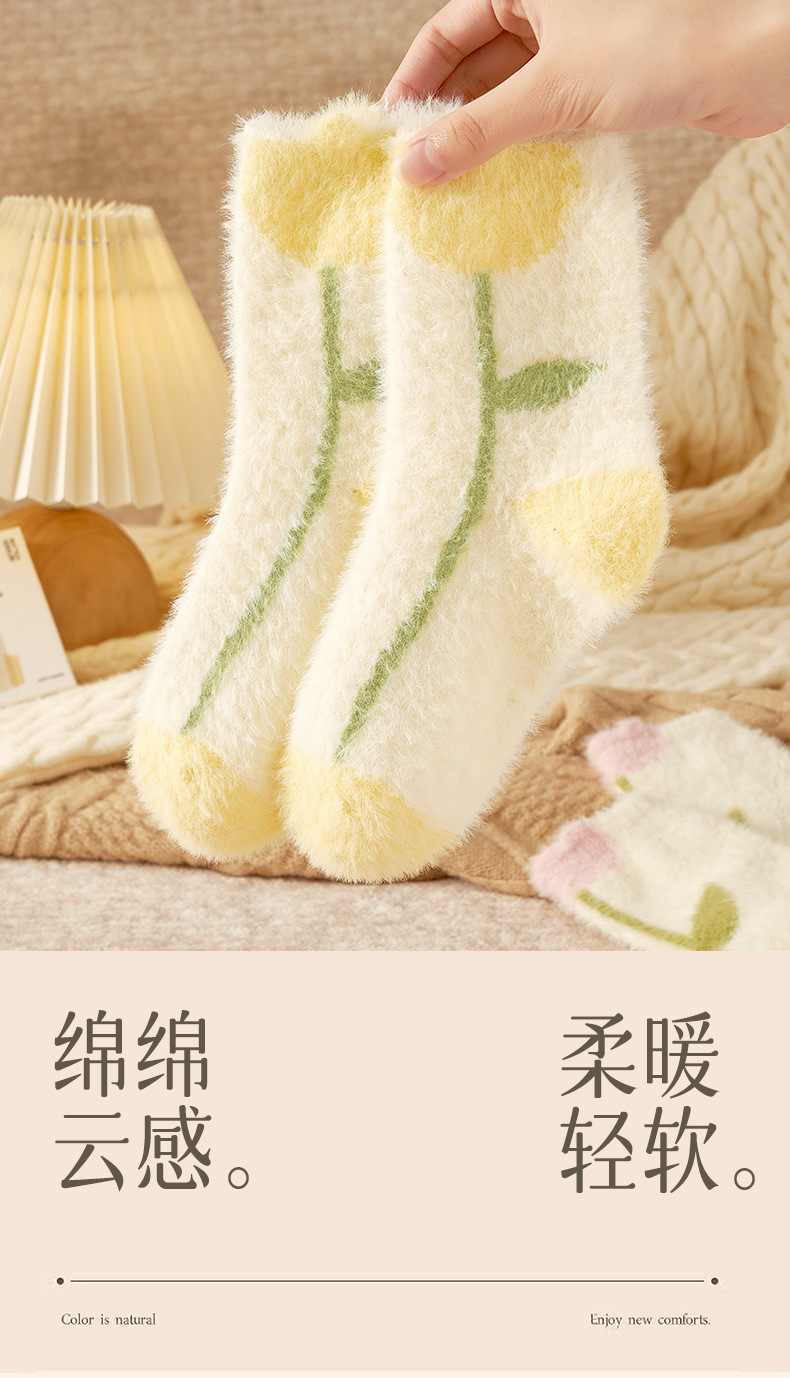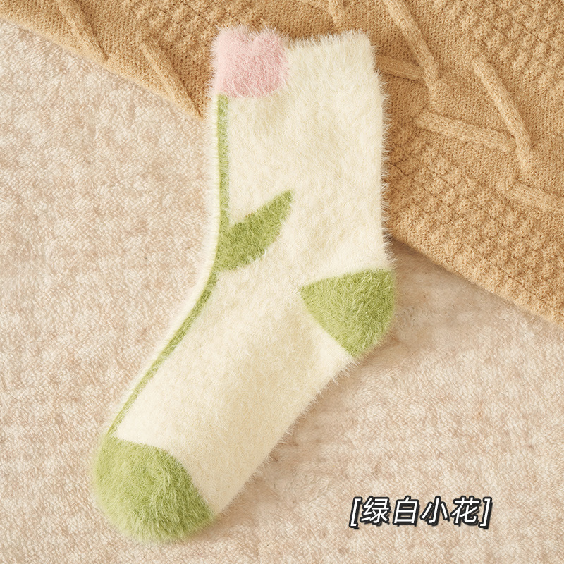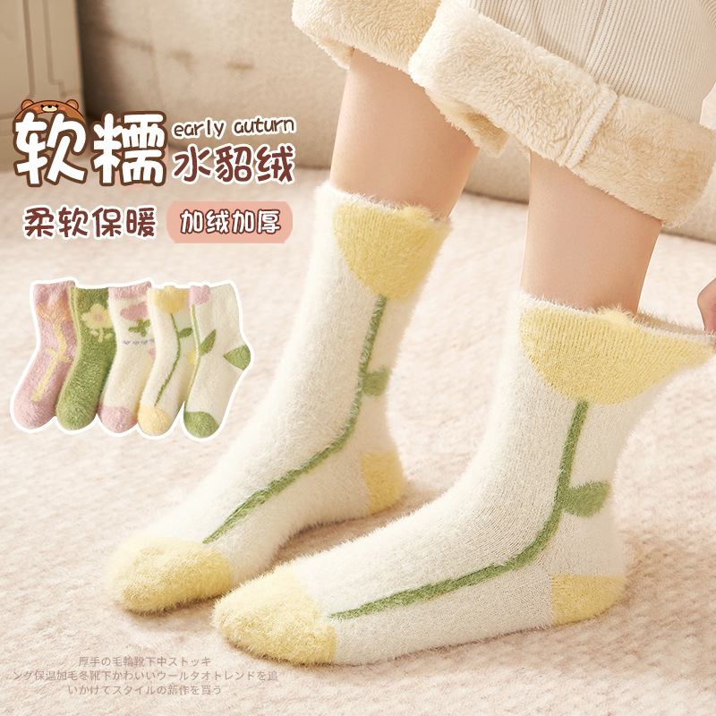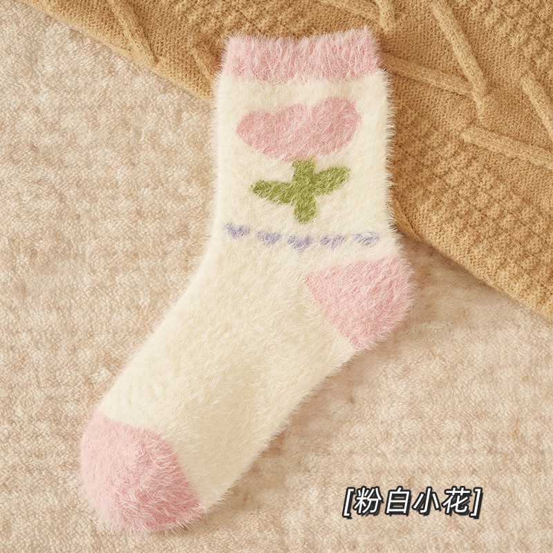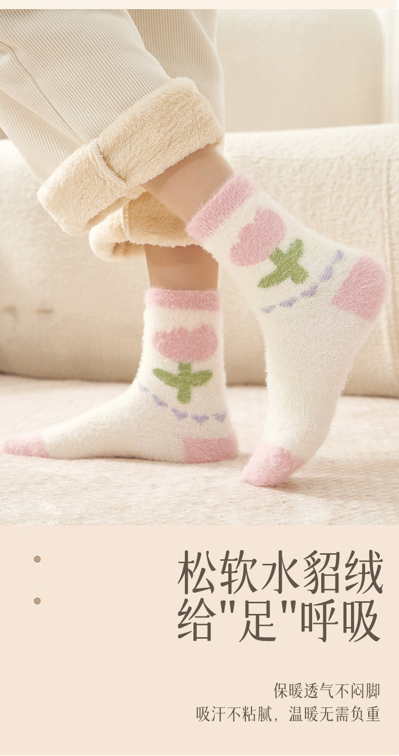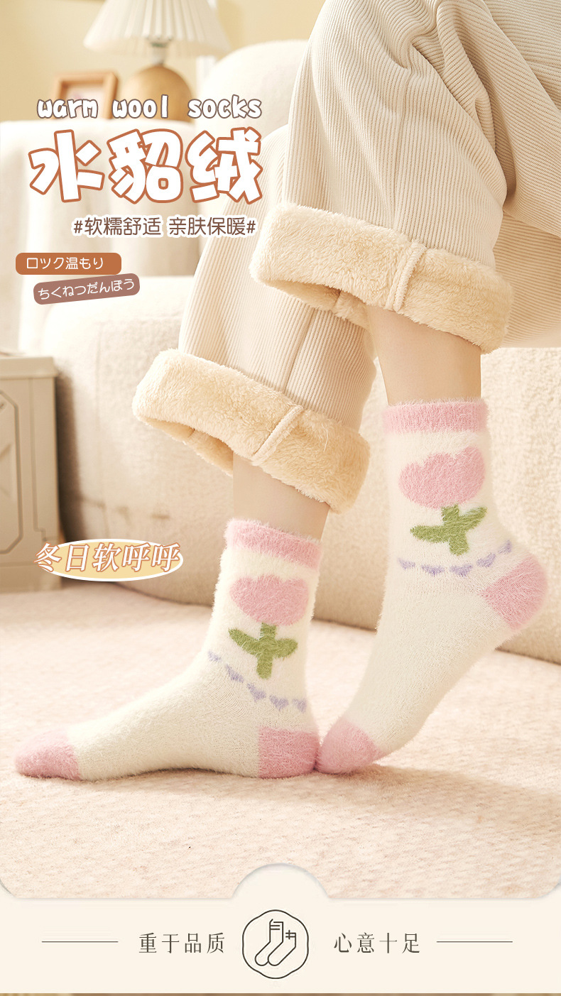 Autumn and Winter Mink Fur Socks for Women Thickened Fleece-lined Warm Japanese Flower Coral Fleece Zhuji Room Socks