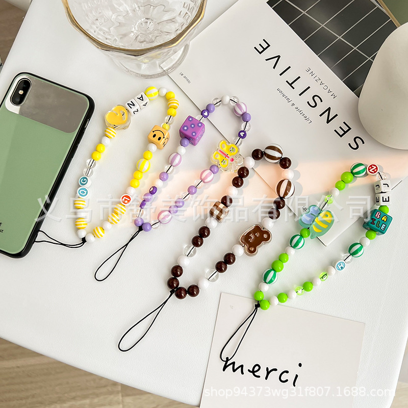 new smiley face beaded mobile phone charm dripping oil lovely mobile phone lanyard drop-resistant mobile phone pendant dazzling color letters ornaments for women