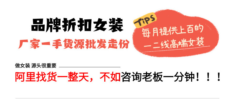 本公司只做分份批发,不做一件代发、零售、挑款和混批等业务。店内品牌女装均为一手货源,100%正品保证,品牌货质量有保障,欢迎现场看货、视频看货。