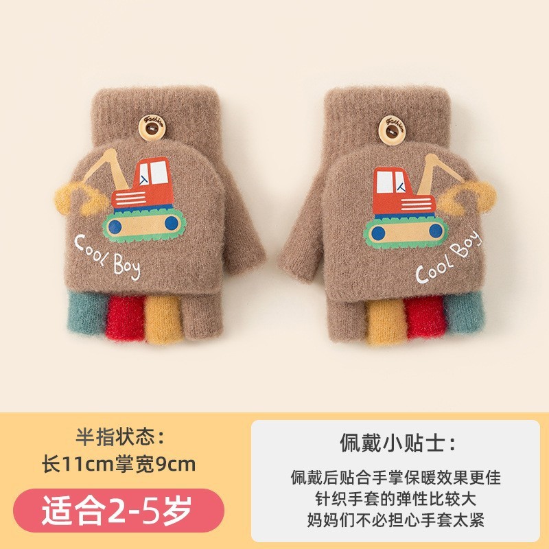 Excavator Children's Gloves Boys' Autumn and Winter Cartoon Cute Half Finger Flip Knitted Wool Cold-Proof Keep Baby Warm