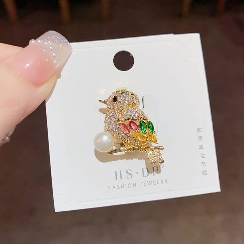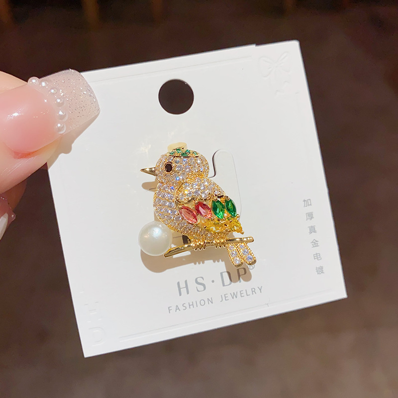 freshwater pearl zircon magpie bird brooch-pin (thick gold plating)