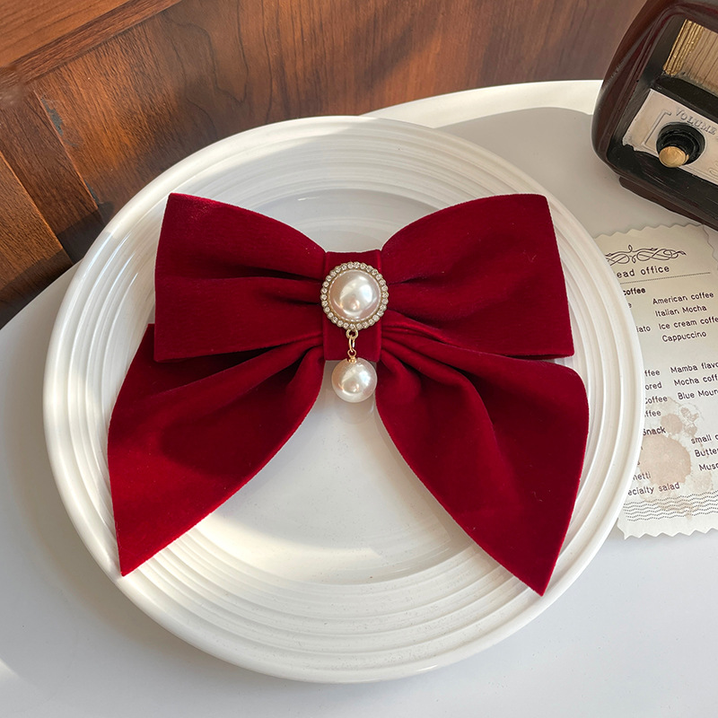 67# wine red bow-big pearl-spring clip
