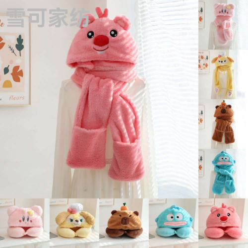 cute cartoon hat neck pillow scarf integrated winter cycling cold protection warm scarf gloves three-piece set gift 中文版