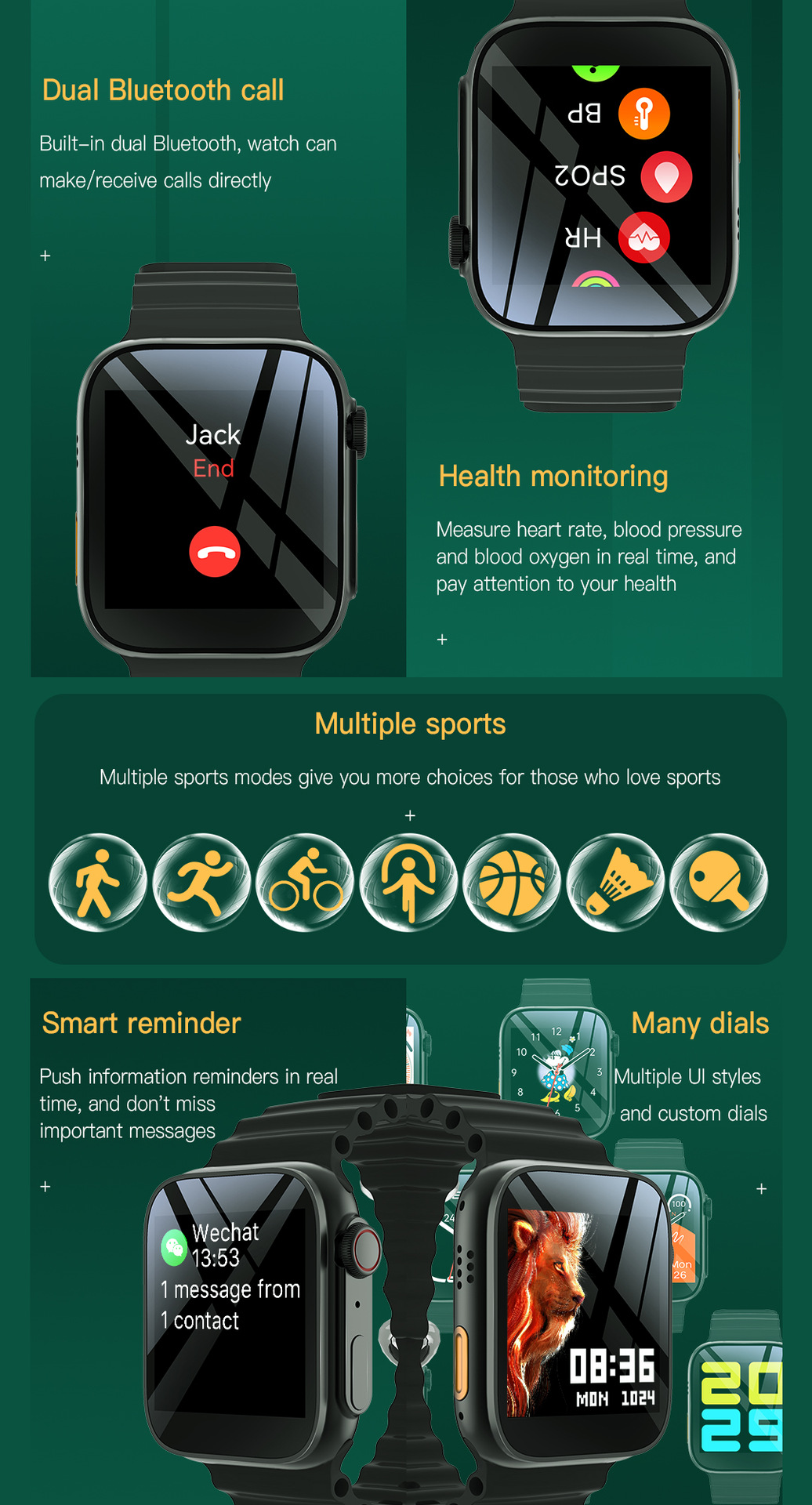 FunctionWaterproof, Step Counting, Heart Rate Monitoring, Social Entertainment, Bluetooth Calling