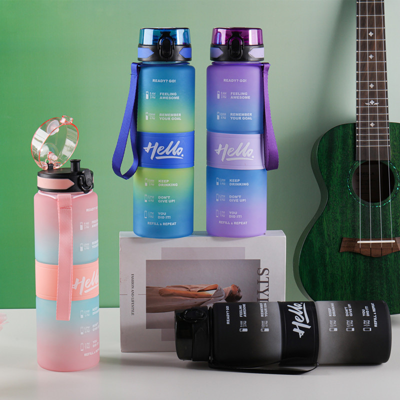 New Colorful Gradient Space Cup with Handle Rope Frosted Feel Outdoor Sports Bounce Cover Plastic Water Cup 中文版