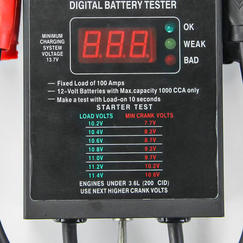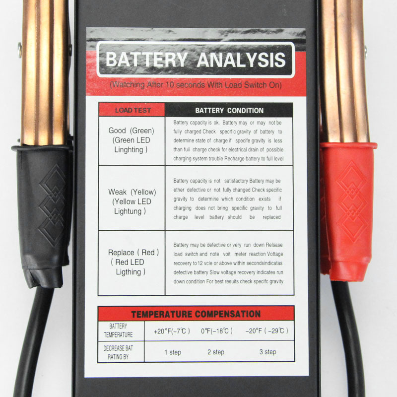 Detect the battery charge status, the test results are divided into four (full, normal, heavy charge, fully discharged), suitable for 10AH-200AH batteries. The circuit of the tester does not need to be separated by the polarity of the battery. The surface of the battery tester clearly indicates the open circuit voltage of the tested battery, plus the detection switch used for testing, which is convenient to use. Connect the tester with the tested battery, and the voltage meter shows the voltage value of the battery. The nominal normal voltage of the battery is 12.5v-13v. When turning the test switch, the indicator drops, and its indication value corresponds to the state of the battery with the corresponding capacity: normal, heavy charge, fully discharged. For a 12v generator, it can be directly tested for generator power.