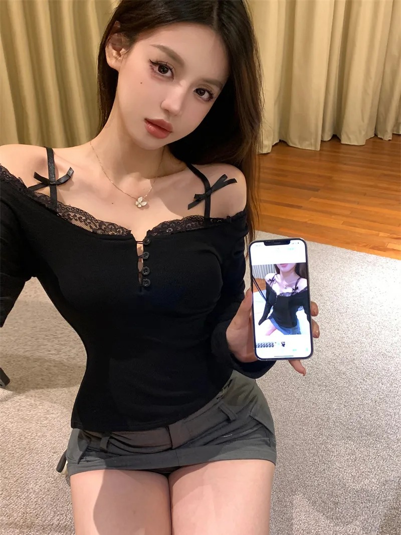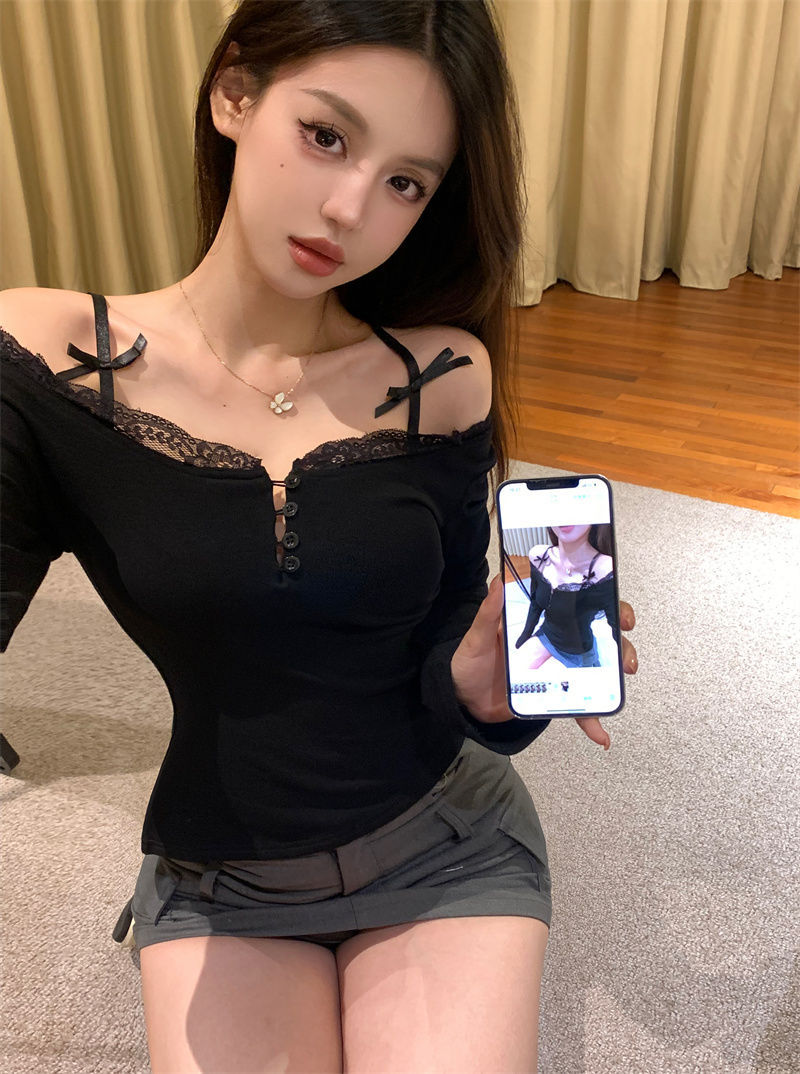 Spring and Autumn Korean Style Lace Long-Sleeved T-shirt Women's Base Shirt Black and White Tight Hot Girl Beautiful Women's Inner Top