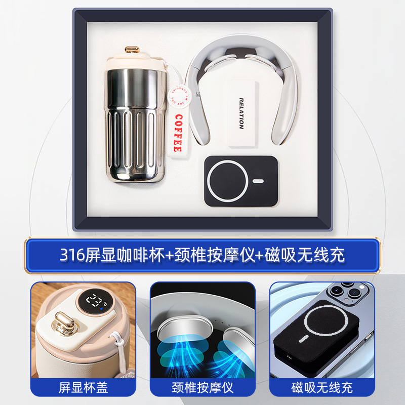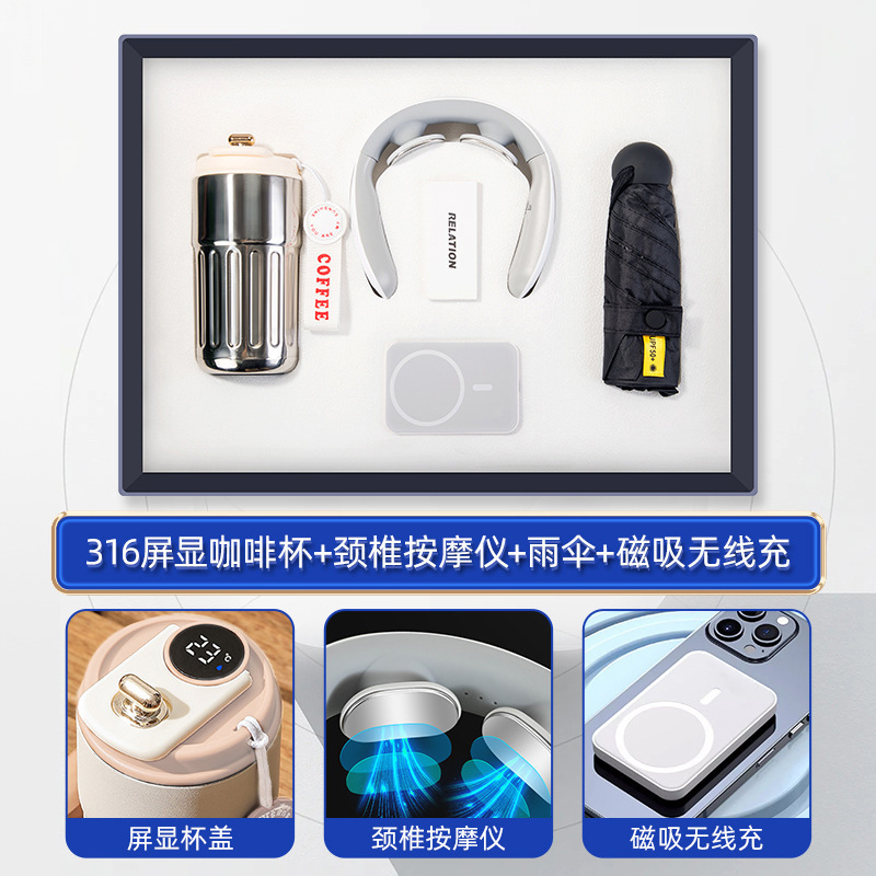 316 screen coffee cup + cervical spine massage instrument + umbrella + magnetic suction wireless charger + backpack-black
