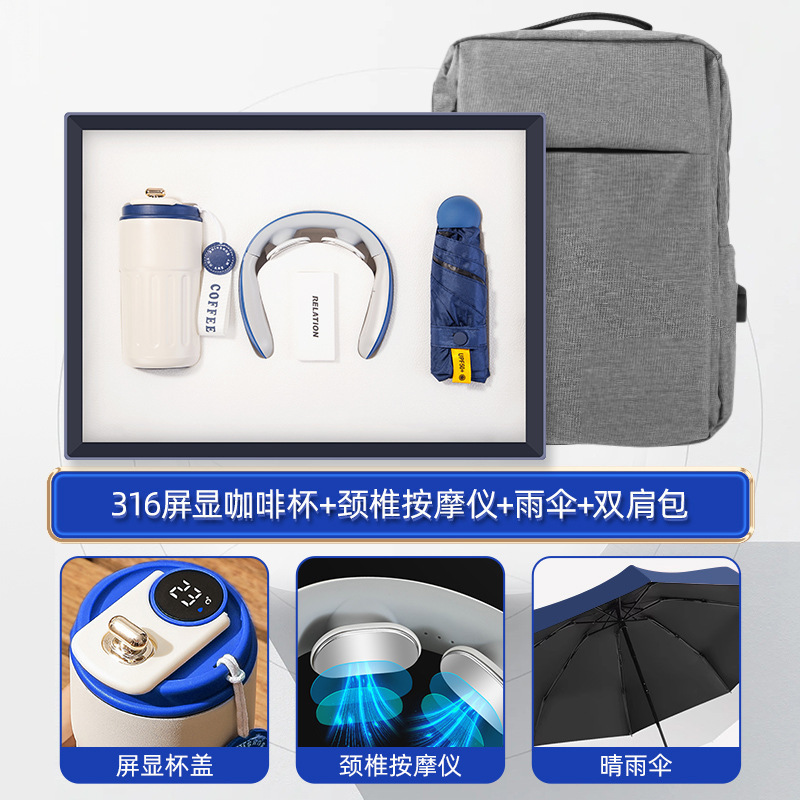 316 screen coffee cup + cervical spine massage instrument + umbrella + backpack-blue