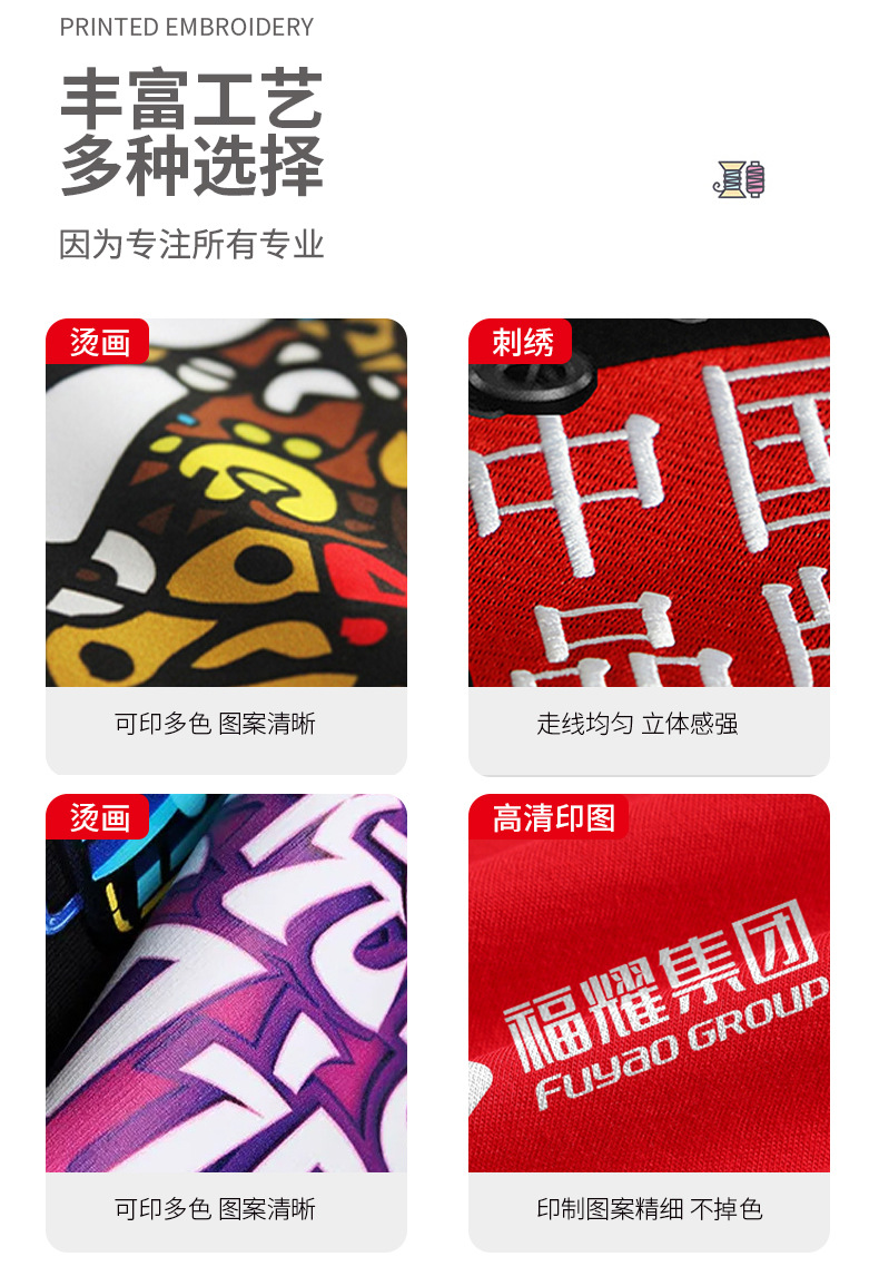 Custom-made designs, company uniforms, printing of logos, patterns, and company emblems... etc. All require additional printing fees.