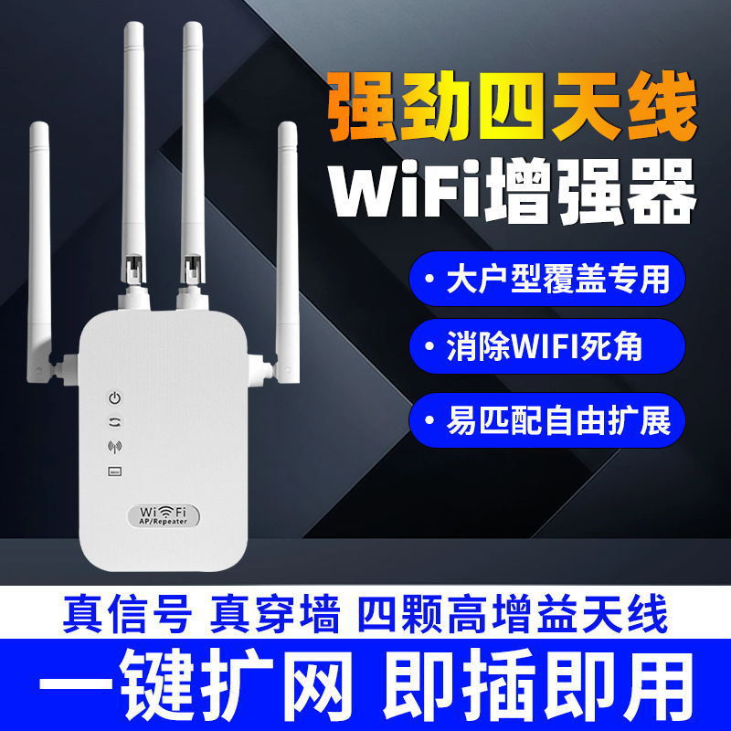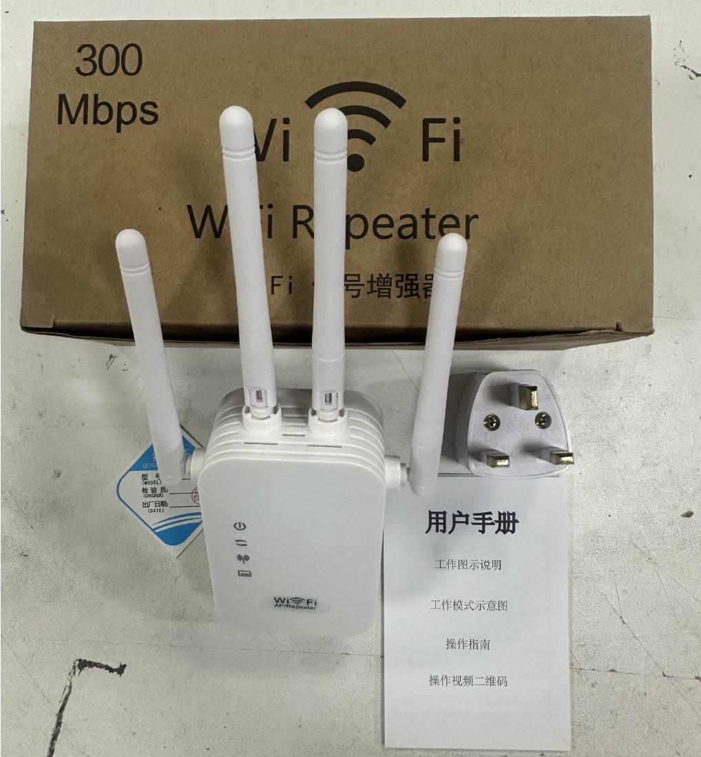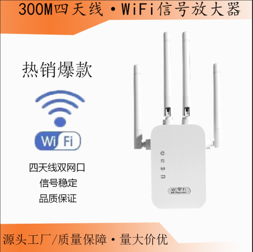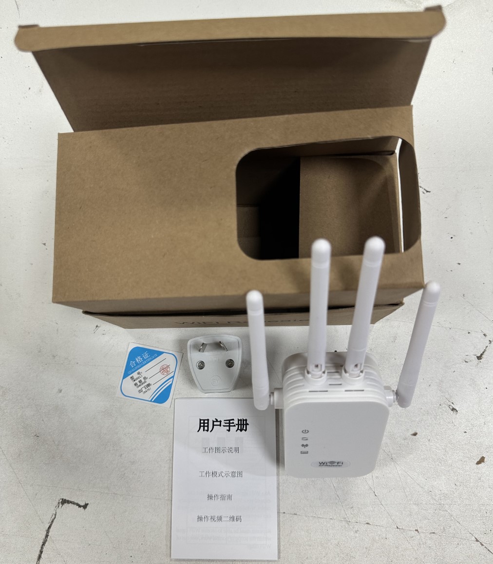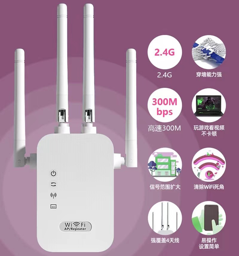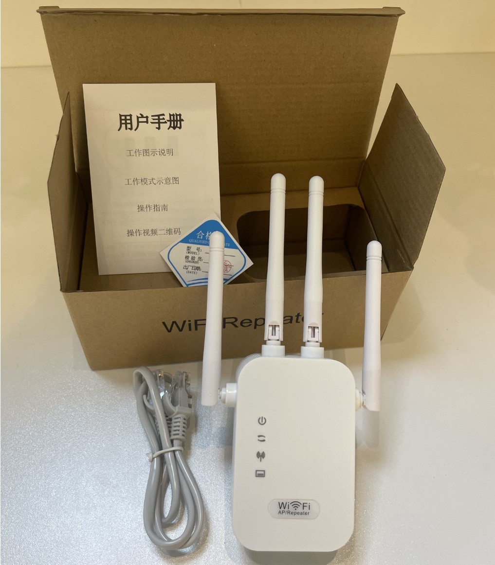 Packing quantity: 60 boxes Specification: 0.087 This device is a 300M/WIFI repeater, commonly known as a WIFI signal amplifier. If the WIFI signal in your home cannot cover all rooms or if there are too many obstructions causing the signal to be poor, you can use our WIFI repeater to amplify the WIFI signal from your router. The signal will be amplified and spread to the rooms that previously had poor signal reception. This product has a 300M and 1200M network speed, and this model is the 300M receiver and transmitter model.