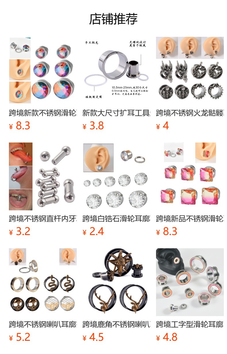 Our company specializes in the production of thousands of piercing jewelry such as stainless steel ear expansions, navel rings, ear studs, nipple rings, brow piercings, nostril rings, acrylic dropleting ear expansions, lip piercings, wood ear expansions, etc. We provide high-quality products for foreign trade platforms such as AliExpress, eBay, Amazon, and Wish. Welcome new and old customers to place orders!