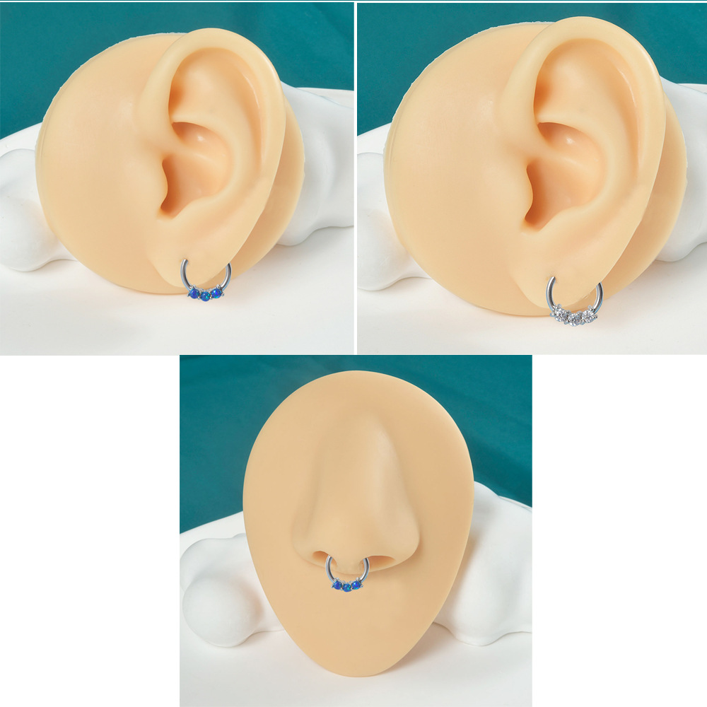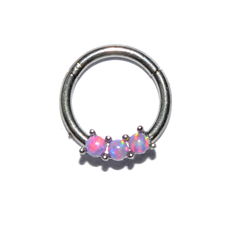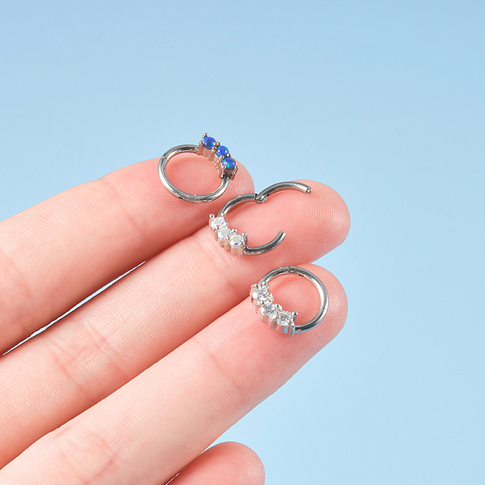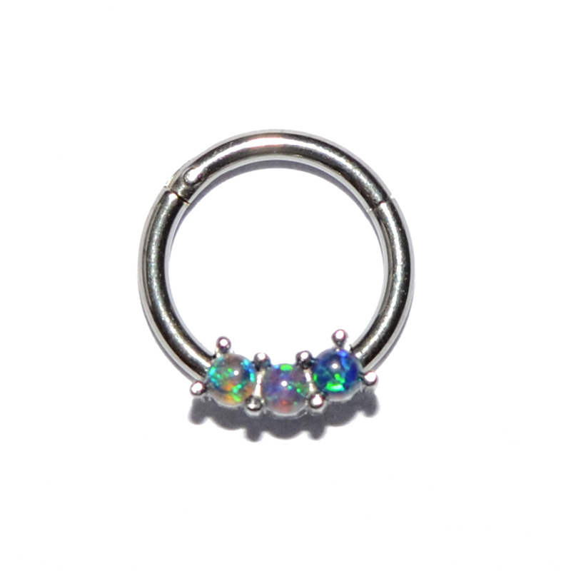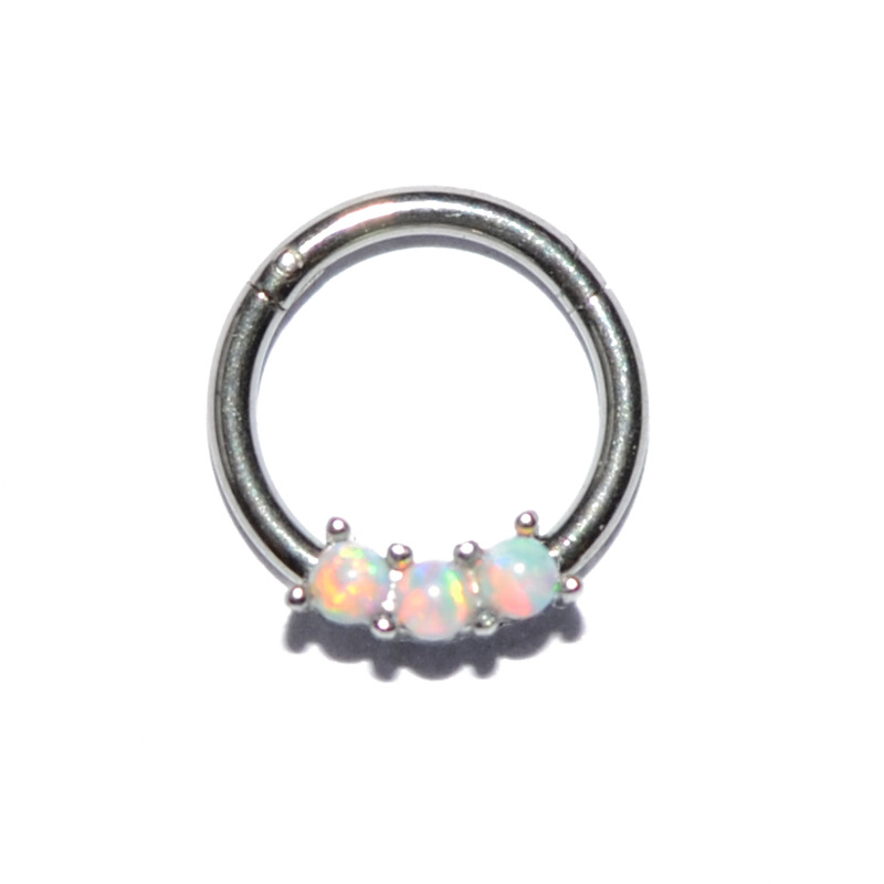 .Name: Cross-border stainless steel three Australian gem nose ring copper clamp zircon closure nose pin ring fire color opal nose ring ear bone ring