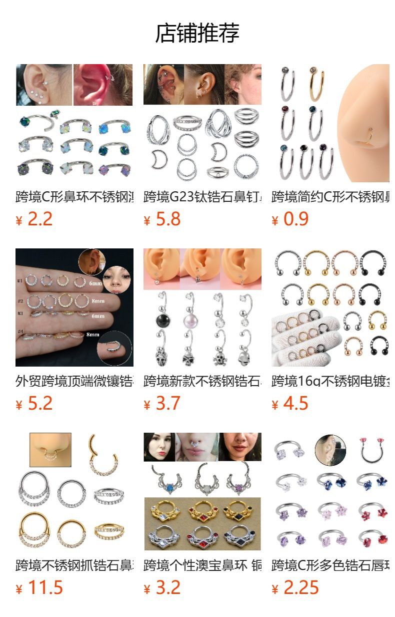 Our company specializes in the production of thousands of piercing jewelry such as stainless steel ear expansions, navel rings, ear studs, nipple rings, brow piercings, nostril rings, acrylic dropleting ear expansions, lip piercings, wood ear expansions, etc. We provide high-quality products for foreign trade platforms such as AliExpress, eBay, Amazon, and Wish. Welcome new and old customers to place orders!