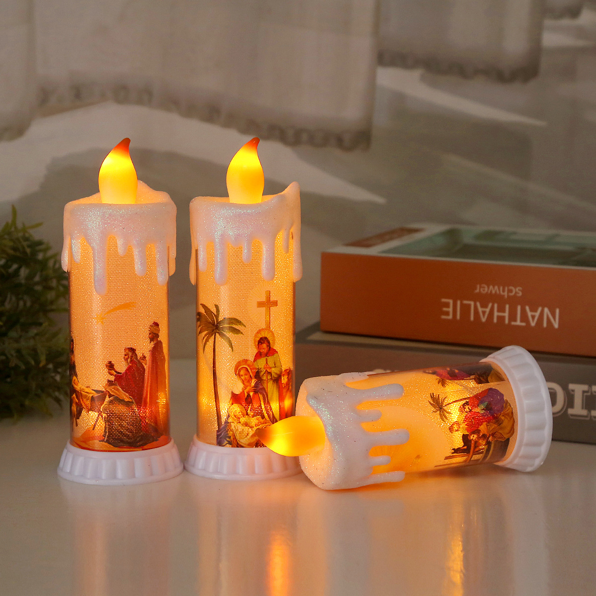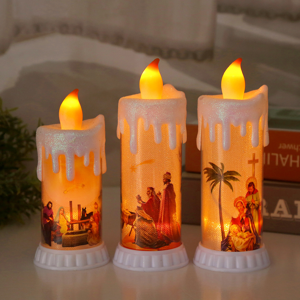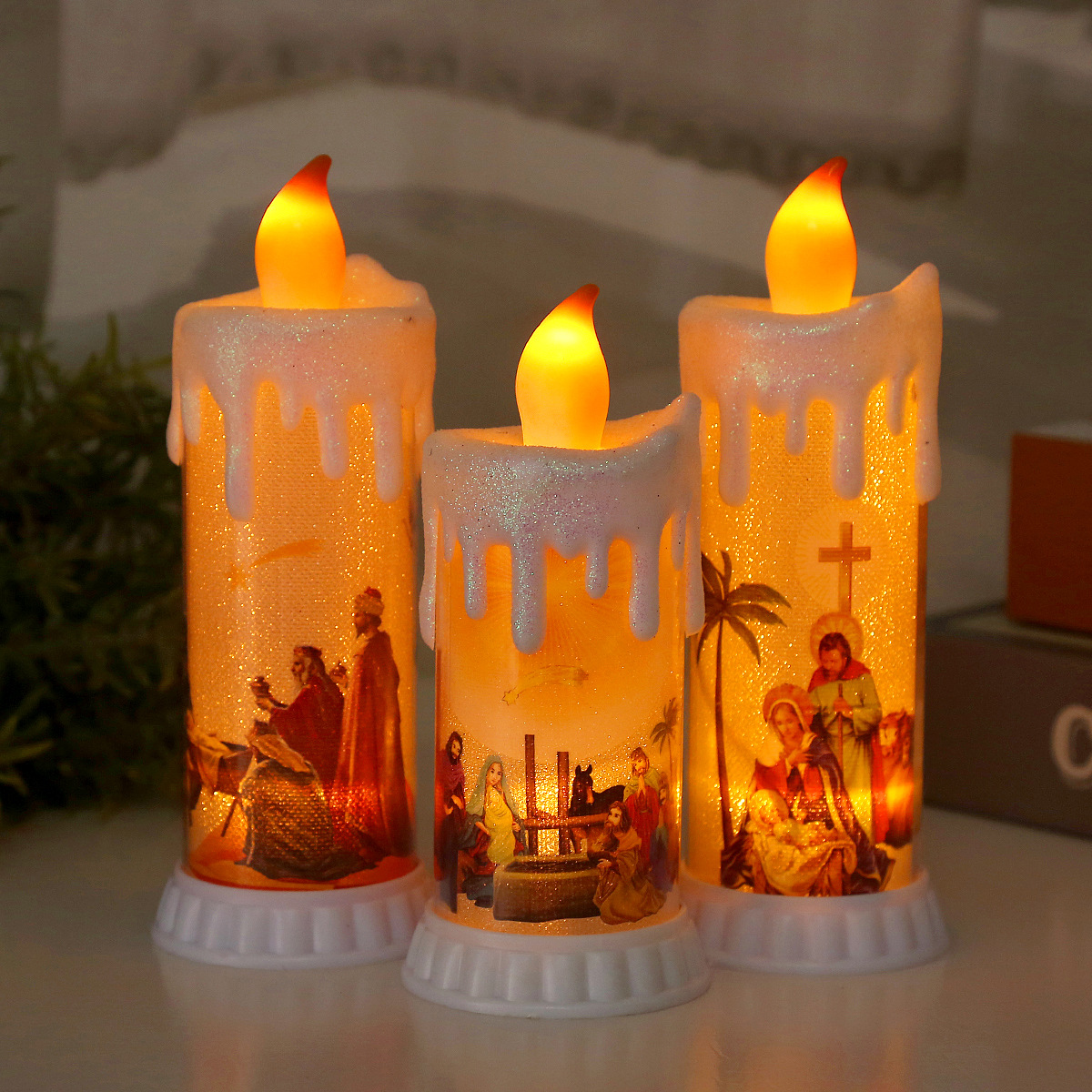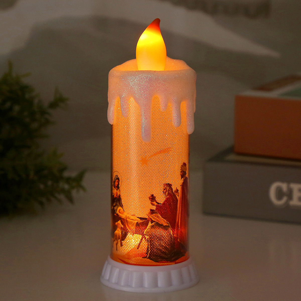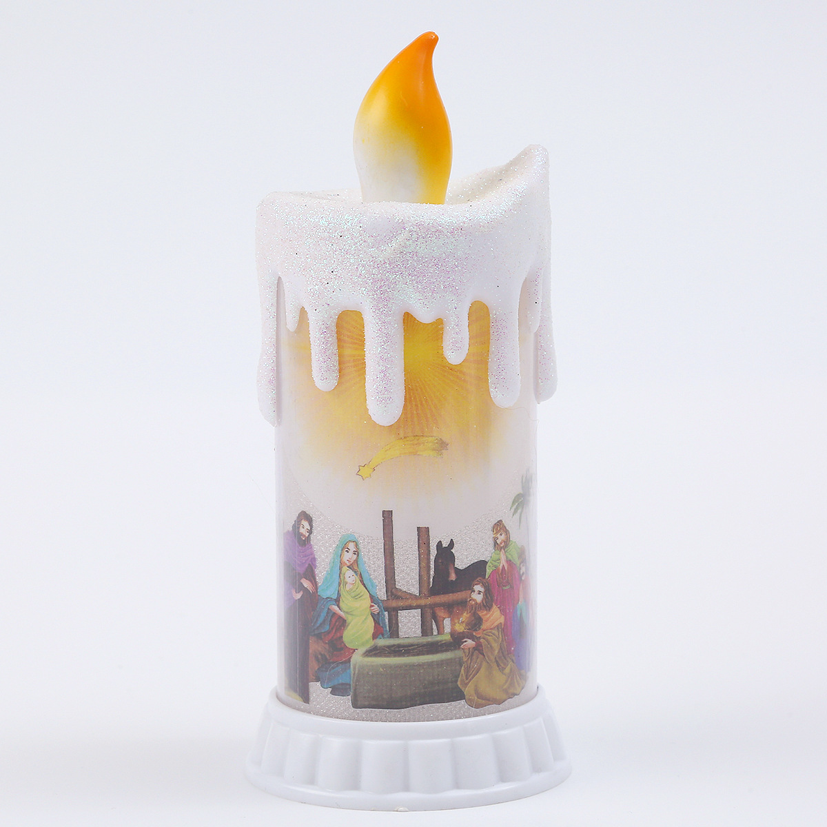 Product: Jesus Electronic Candle The bulb's warm yellow light flickers + the base's yellow light
