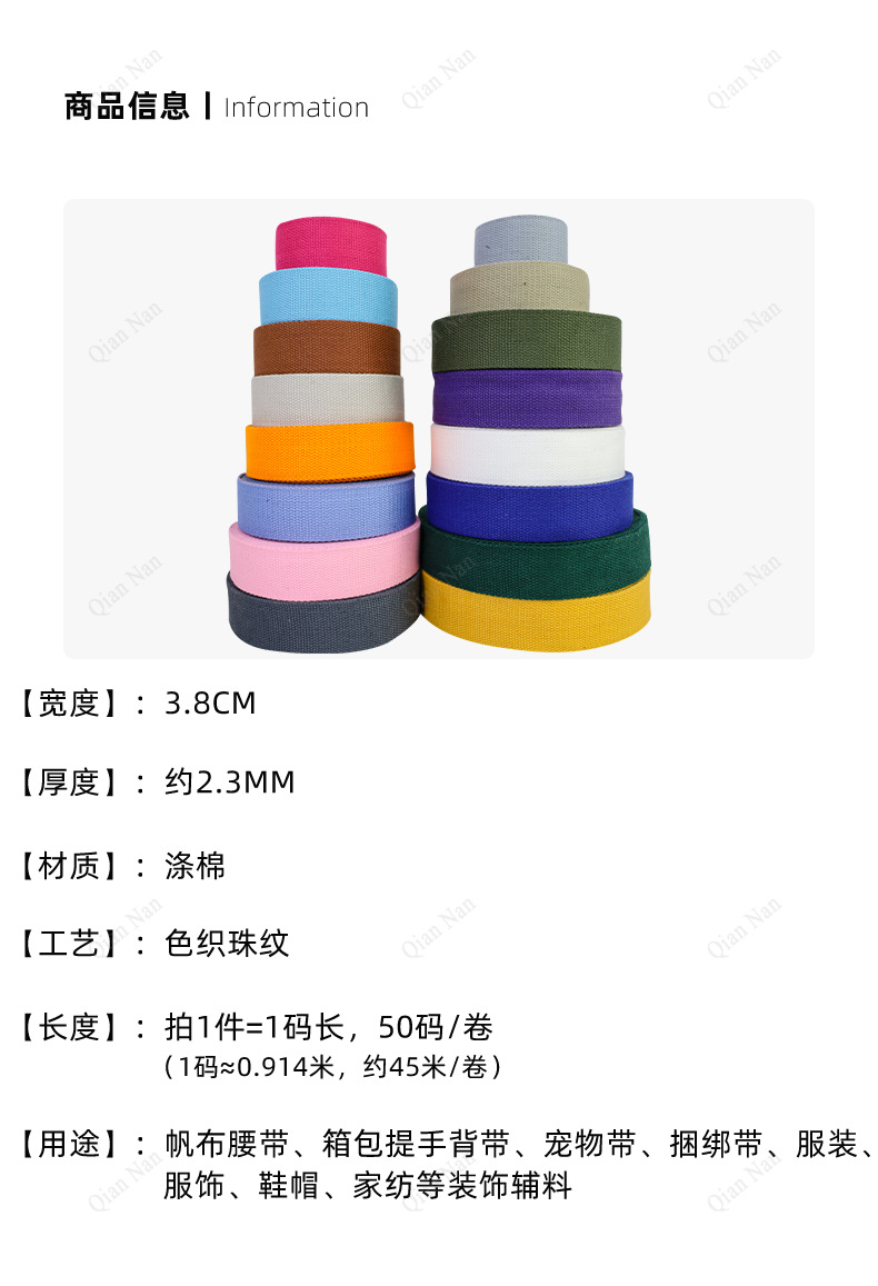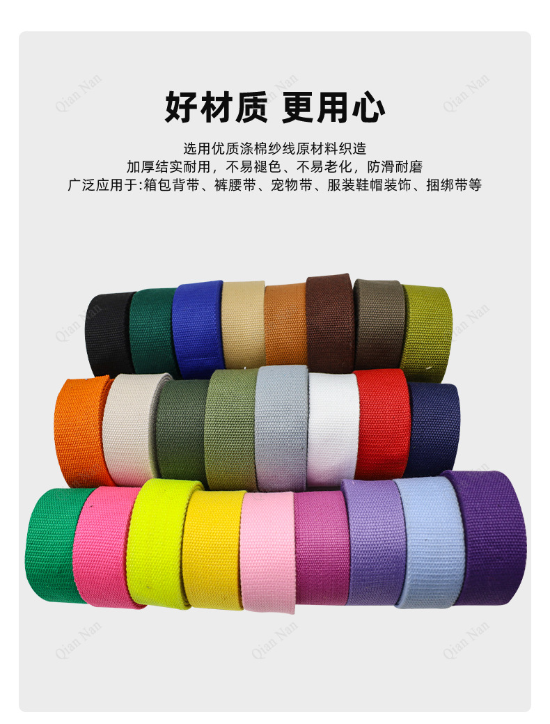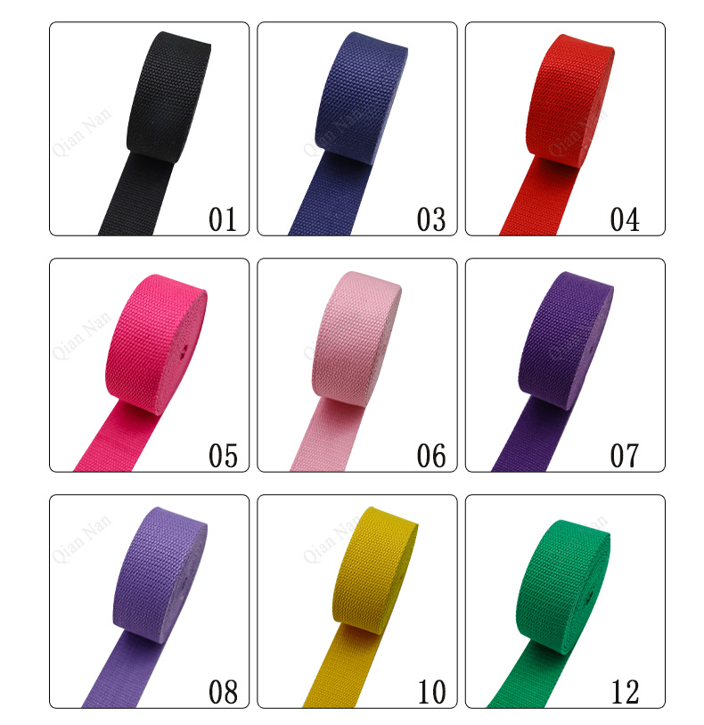 Our factory specializes in the production of: cotton ribbons (100% cotton and cotton-polyester blends),LuggagePP bands, computer jacquard bands, computer jacquard elastic bands, hemstitching machine elastic bands, edging bands, round rope bands, and other elastic and inelastic textile products, with a full range of specifications and a variety of varieties.Widely used in: clothing, belts, luggage, pet leashes, shoes and hats, leather goods, sofas, seat cushions, toys, sleeping bags, fitness equipment, tents, military supplies and various labor protection products industries, with a wide range of varieties and complete specifications, professional technology. The registered trademark includes Ronghua, Qianglong, Qiannan.Welcome to purchase or to order custom-made samples.