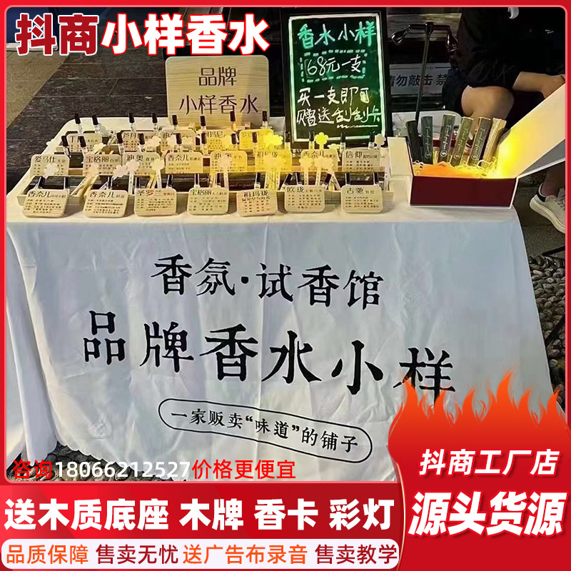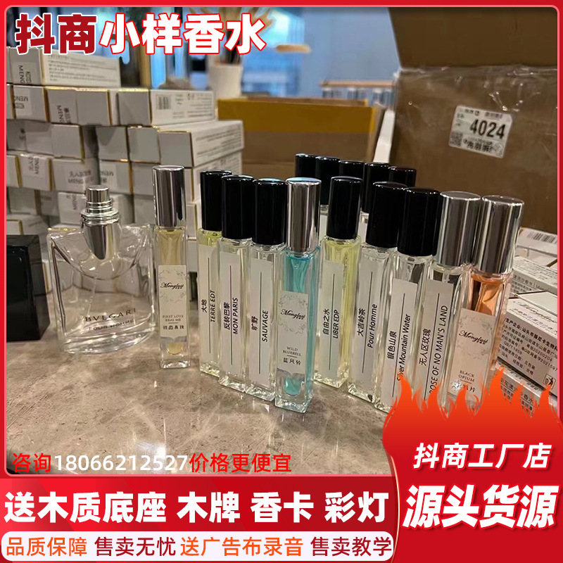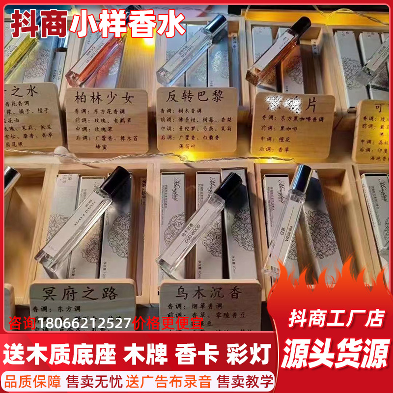 MENGLUSI品牌小样香水,夜市热卖产品,拿货2400一套,卖29 39一瓶夜市爆款,配300瓶10毫升玻璃瓶品牌小样,送30个香水木制底座,30个名字木牌,大广告木牌一个,试香卡,赠送大气网红地摊桌布,彩灯一套,补货可以根据客户要求配货
