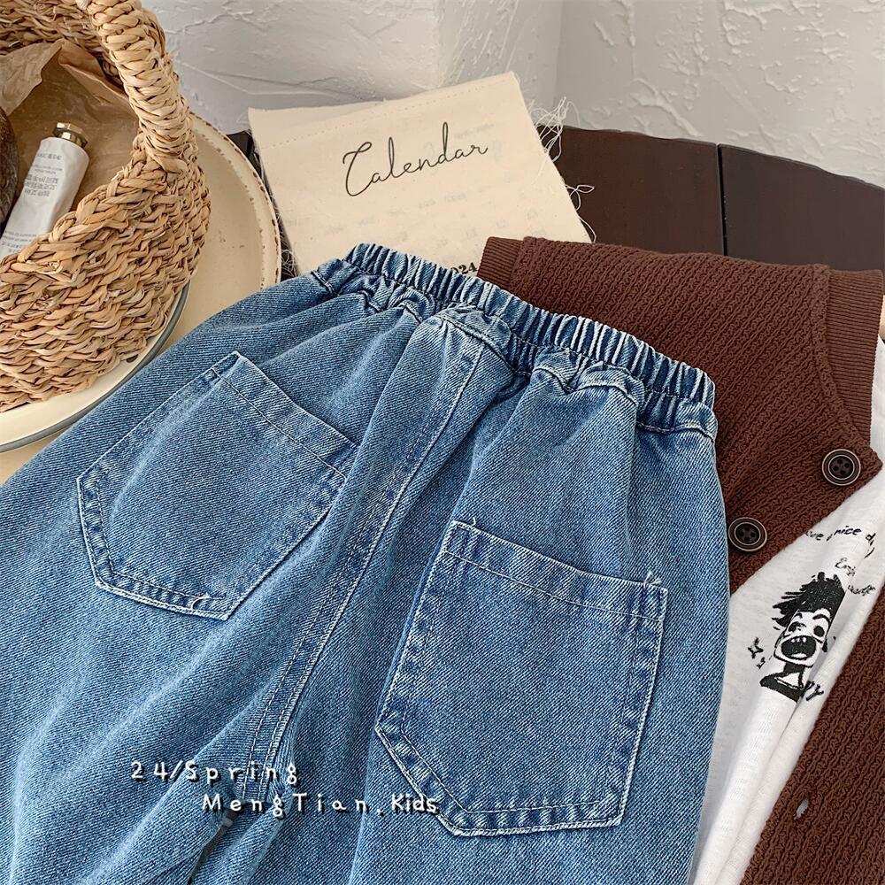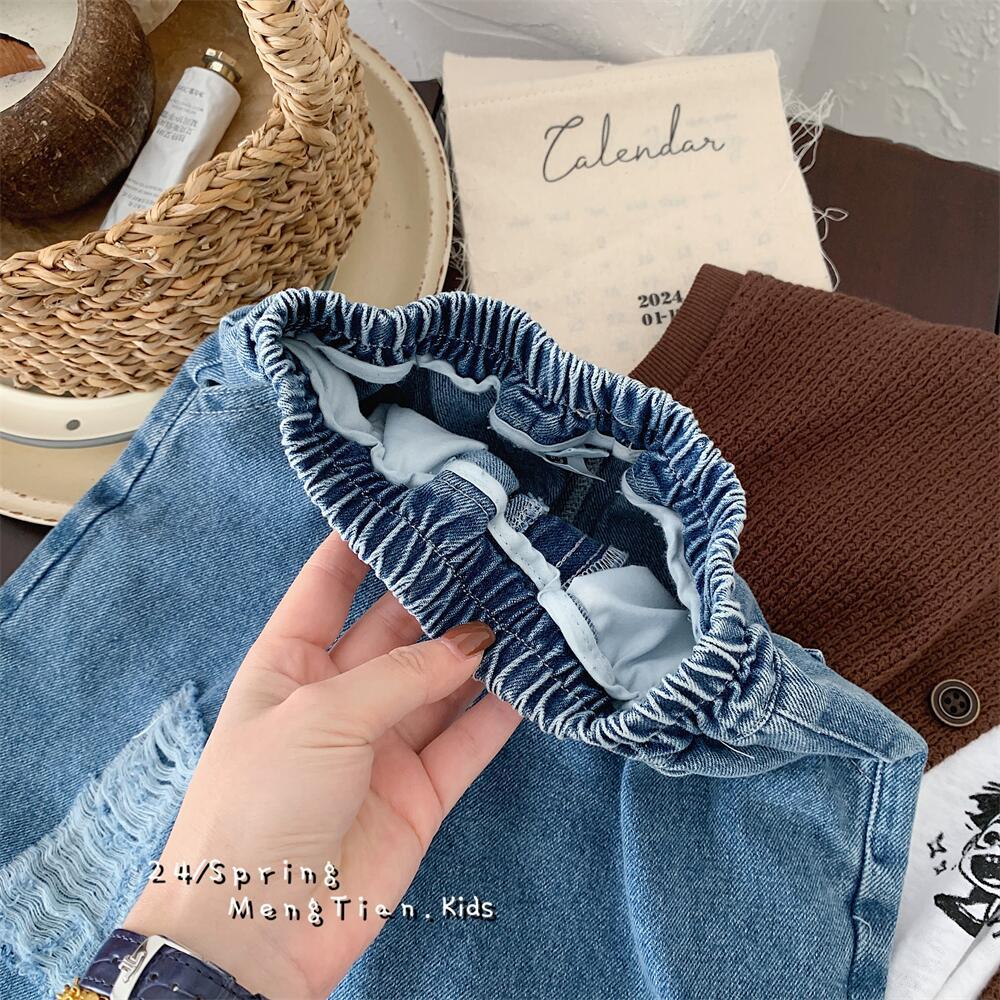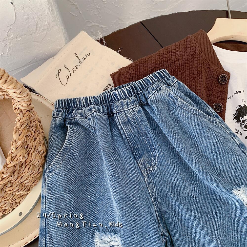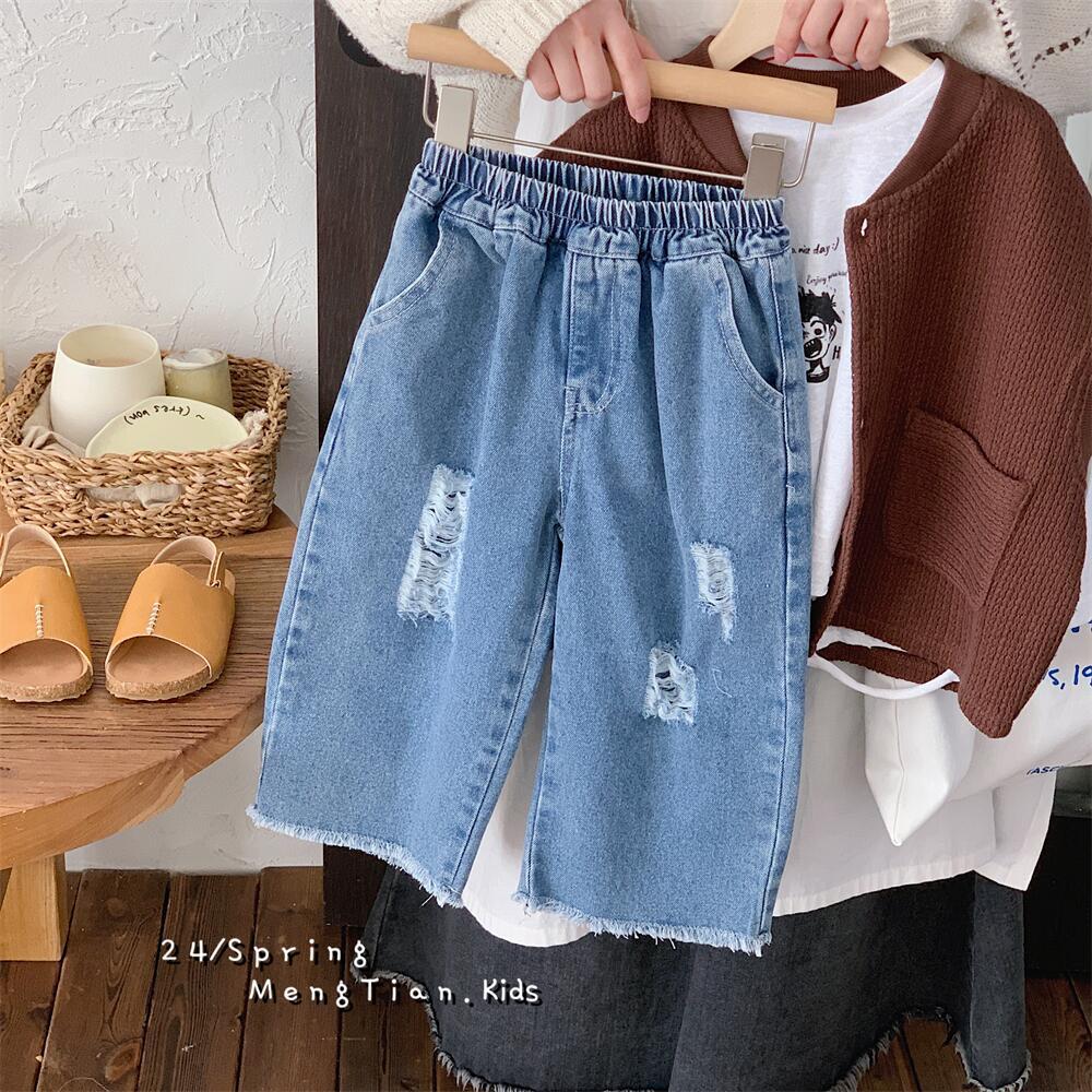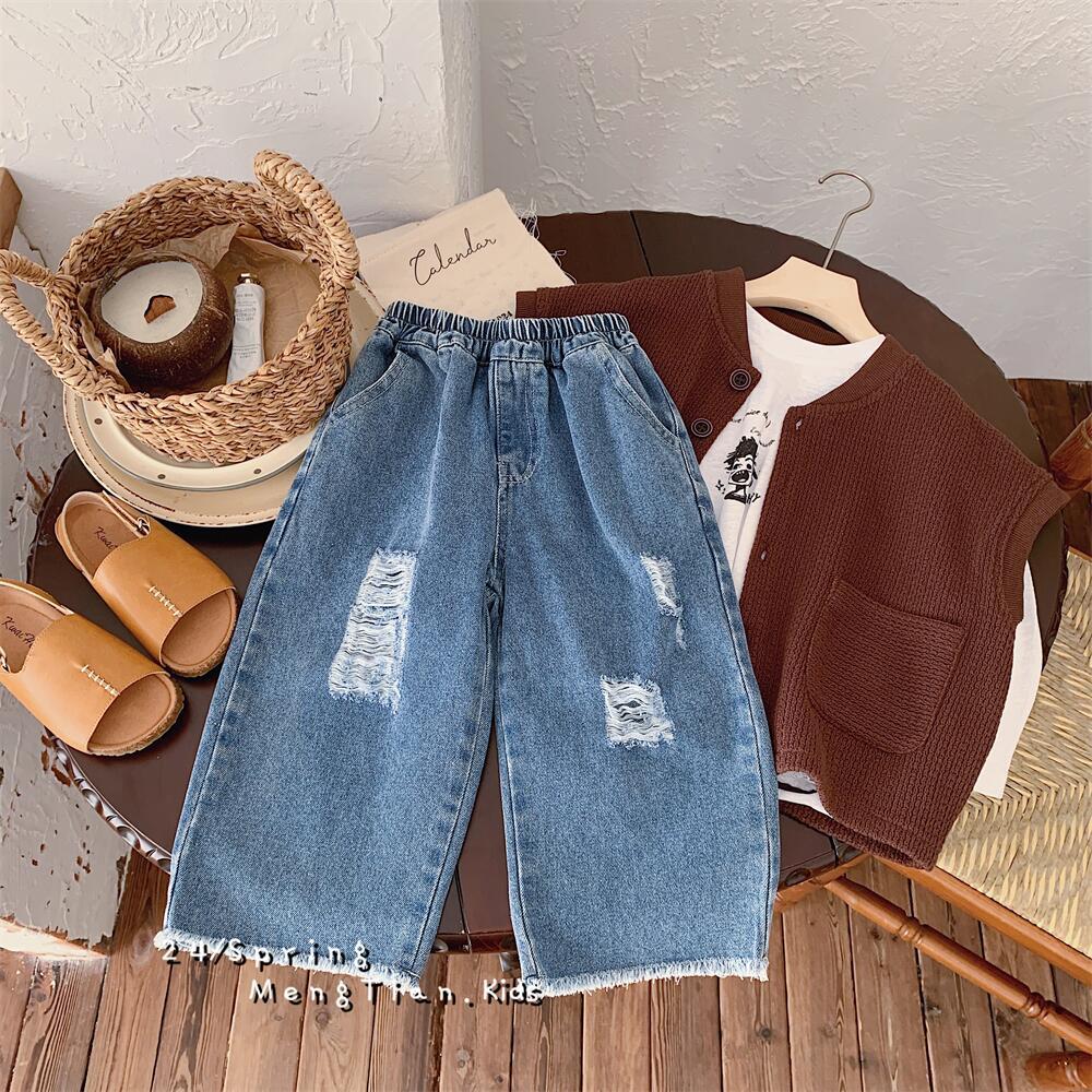 Crawler 2024 Spring Boys and Girls Korean Style Light Color Hole Denim Straight-Leg Pants Children's Casual Loose Wide-Leg Pants 中文版