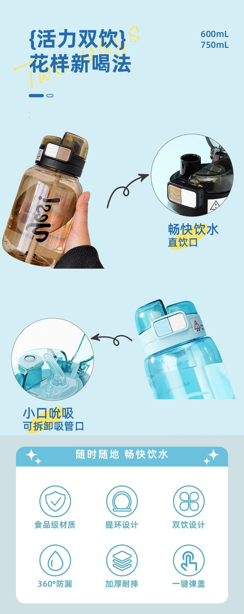 Water Cup Good-looking Summer New Cup Student Sports Large-Capacity Water Cup Food Grade Material Plastic Cup Water Cup 中文版