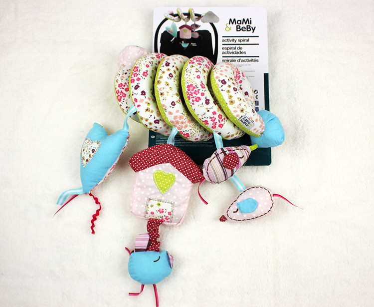 The bed has three hanging accessories, a blue heart-shaped one with a rattle inside, a heart-shaped house with music inside, and finally, two small fish connected together, each with a clapper and a BB bomb function.