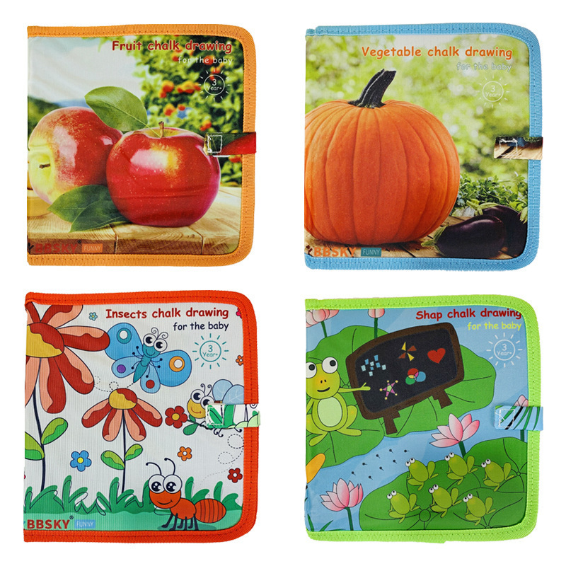 This is a chalk portable sketchbook. The sensitive period of painting for babies usually begins around 18 months. During this period, babies like to doodle on various walls, desks, and sofas. The cover and back cover of the portable sketchbook are made of canvas material, and the inner pages are made of plastic canvas, which are both waterproof and easy to clean. Drawing with this sketchbook has the graffiti effect of chalk and the color saturation of crayons. You can wipe away the painting traces with a wet cloth, making it convenient and clean, and it can be reused.