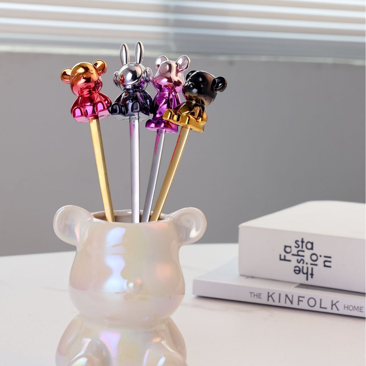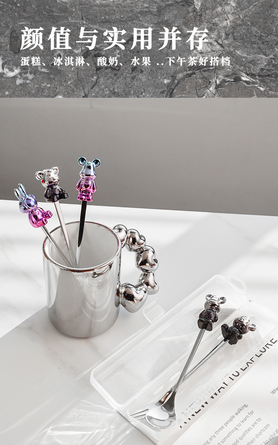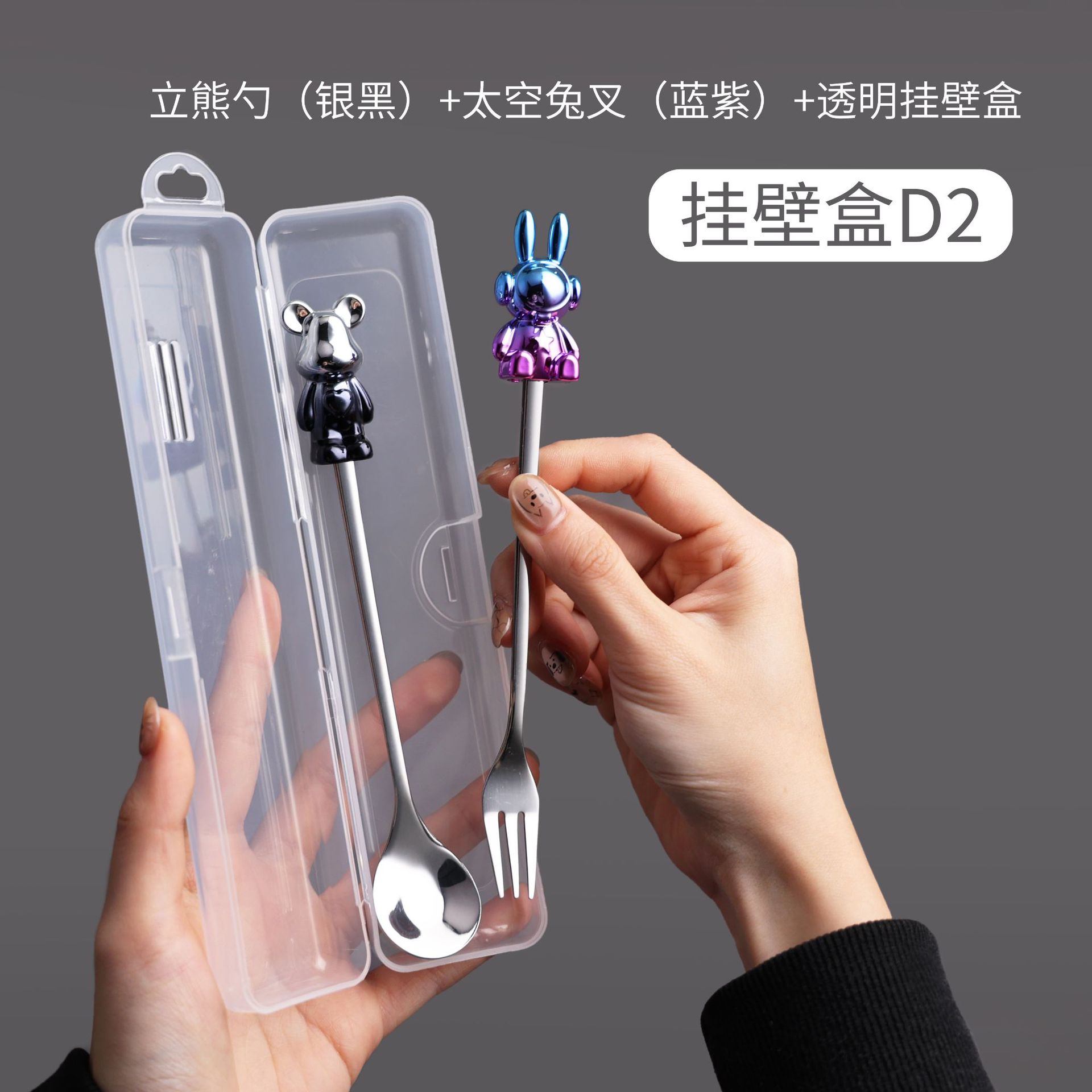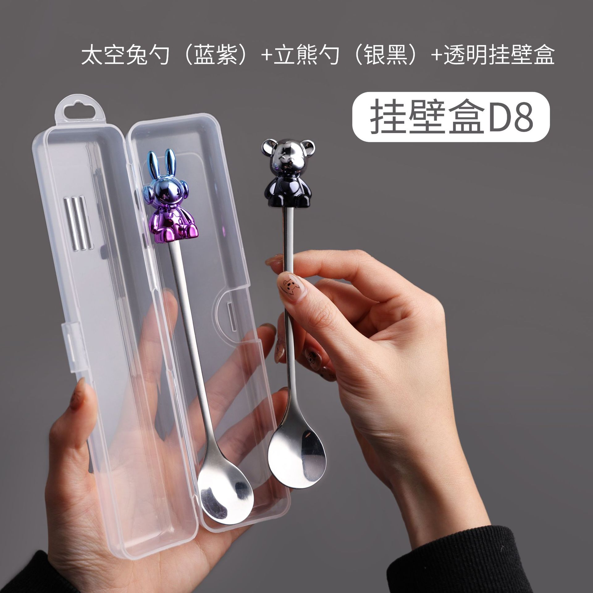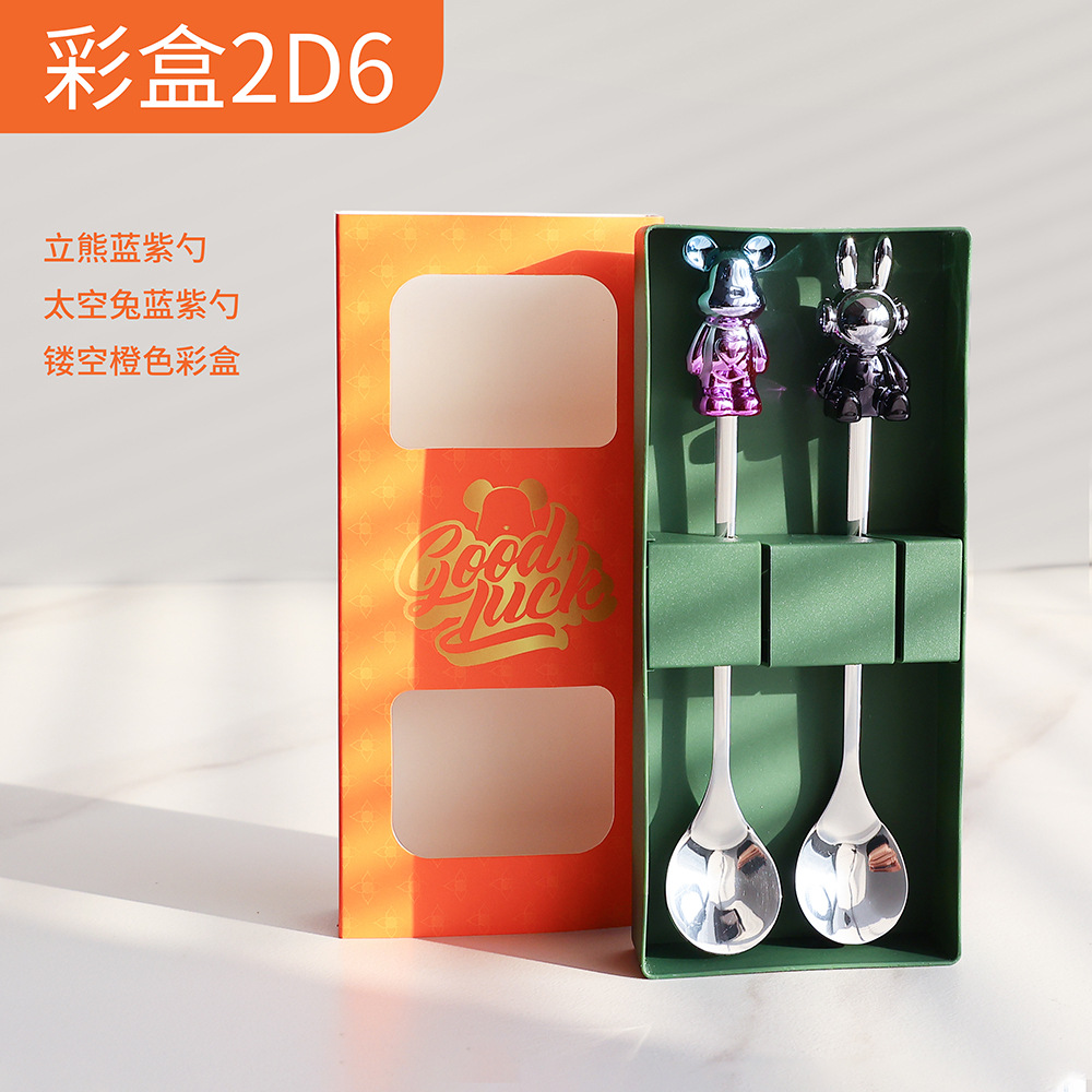 d8 blue purple space rabbit spoon/silver black sitting bear spoon + storage box