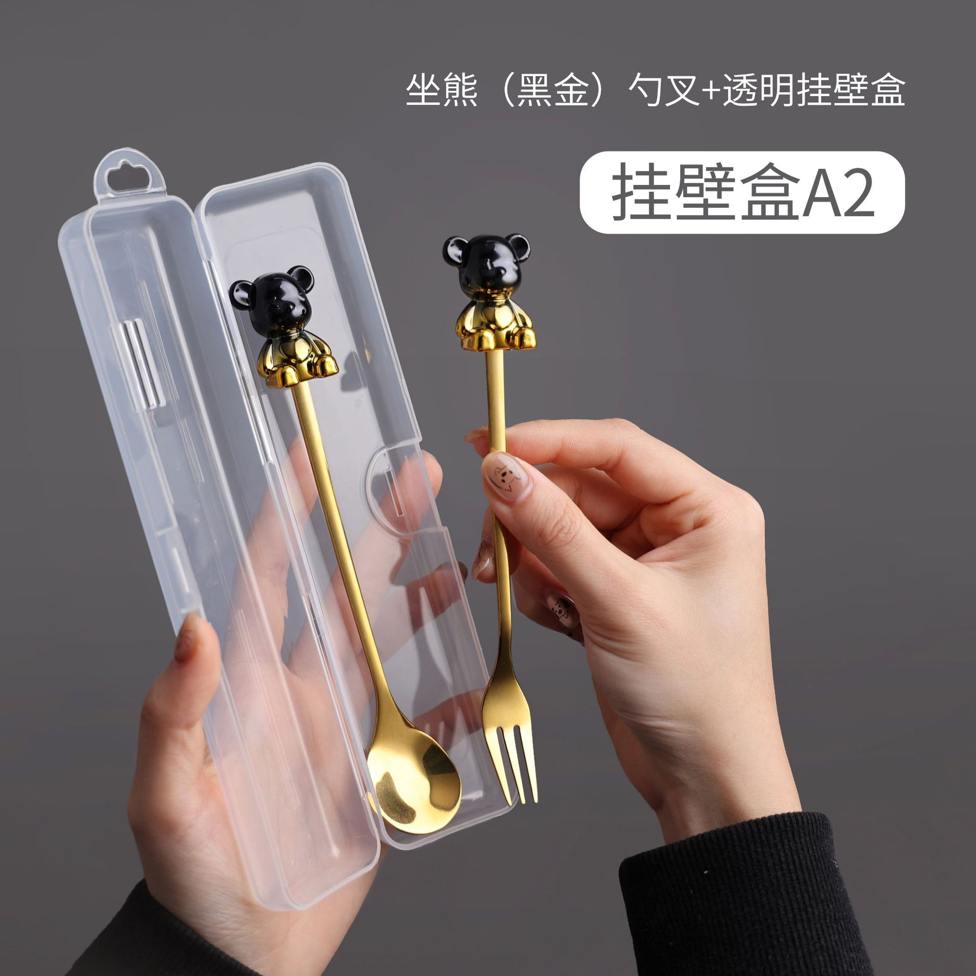 a2 black gold sitting bear spoon fork + storage box