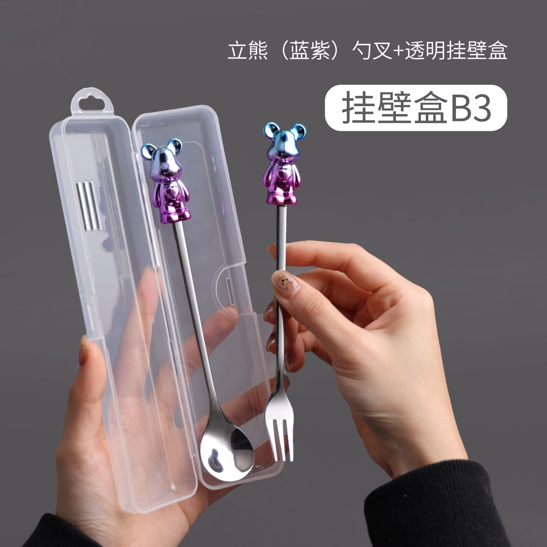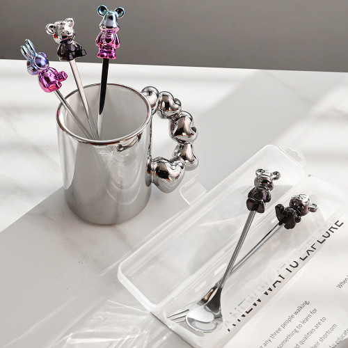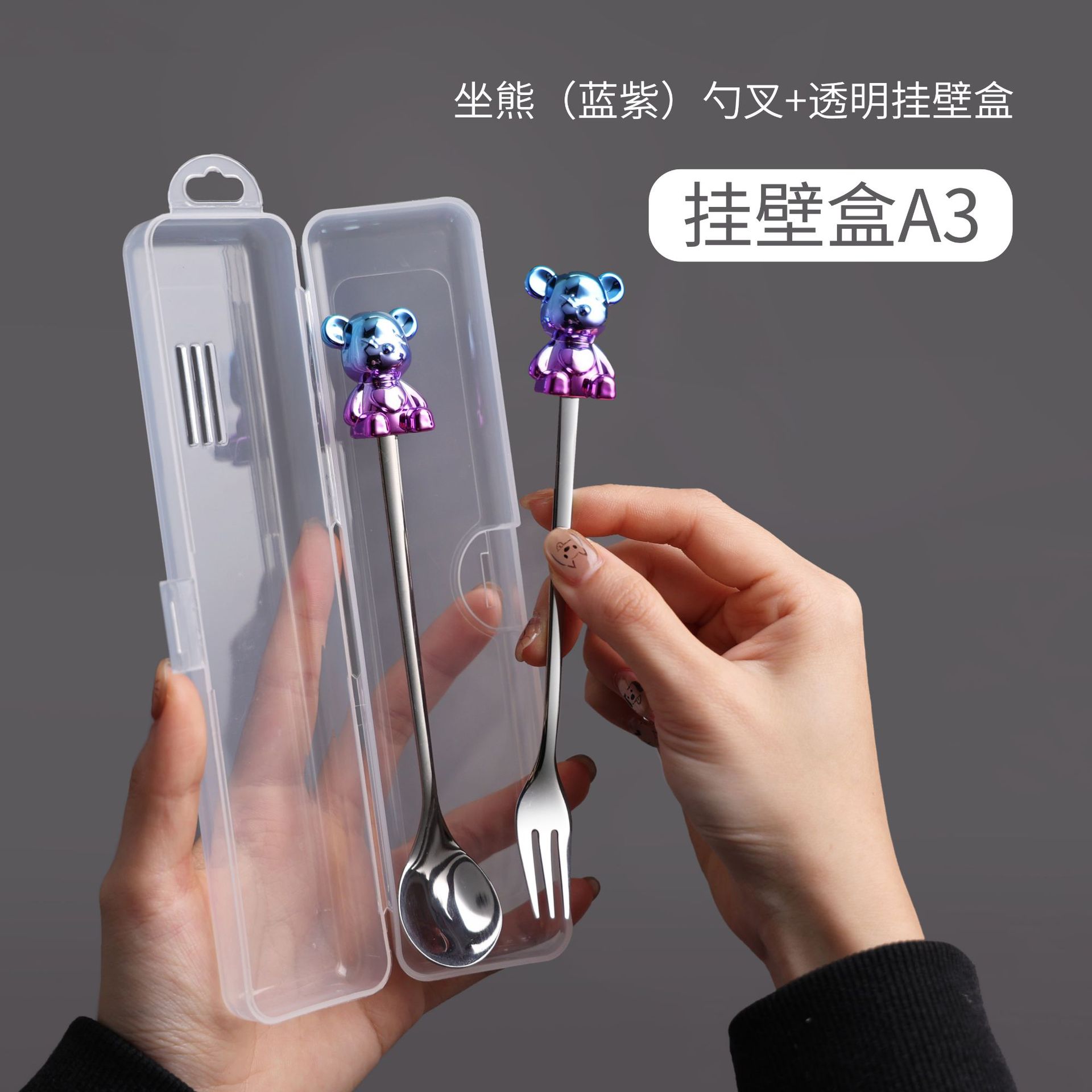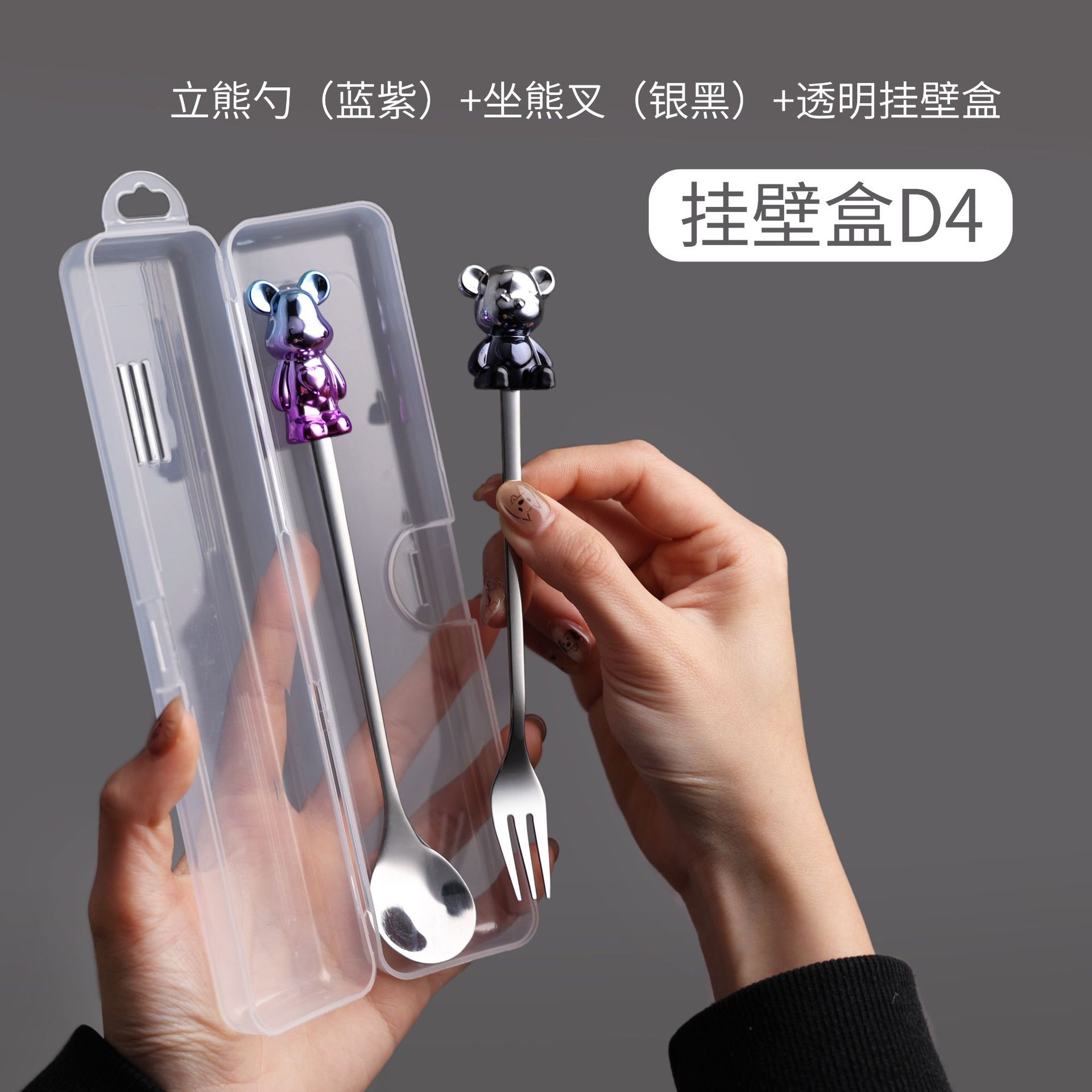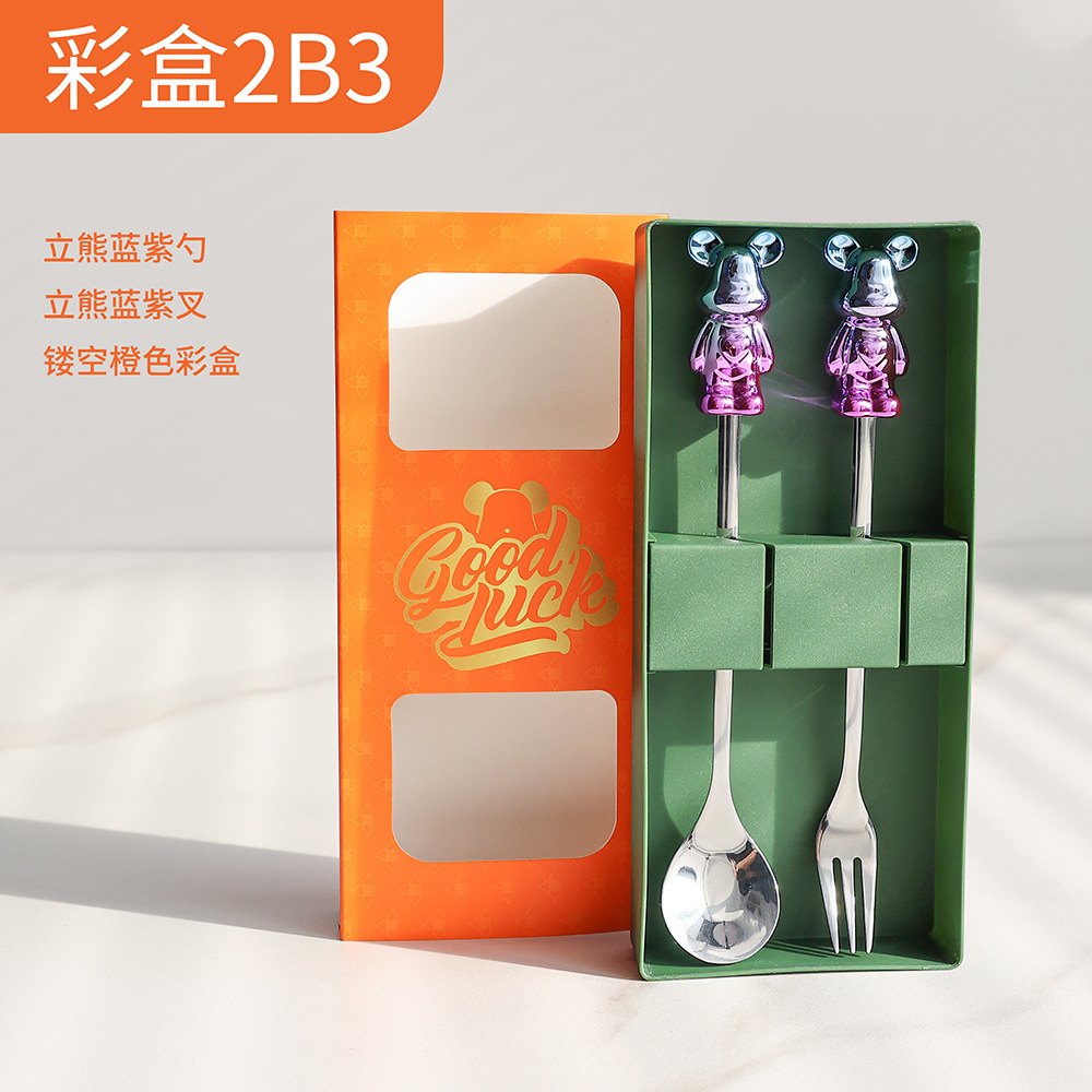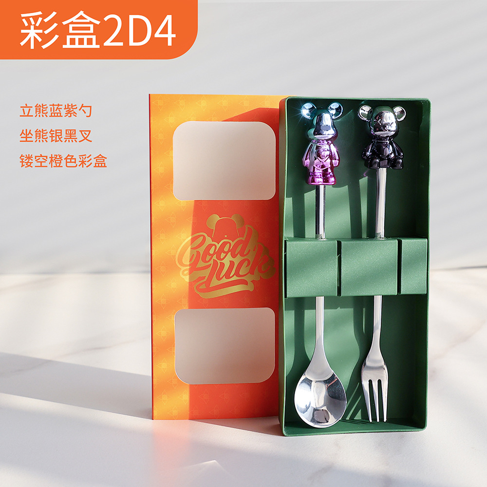 d4 blue purple bear spoon/silver black bear fork + color box