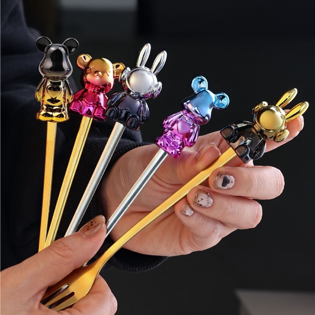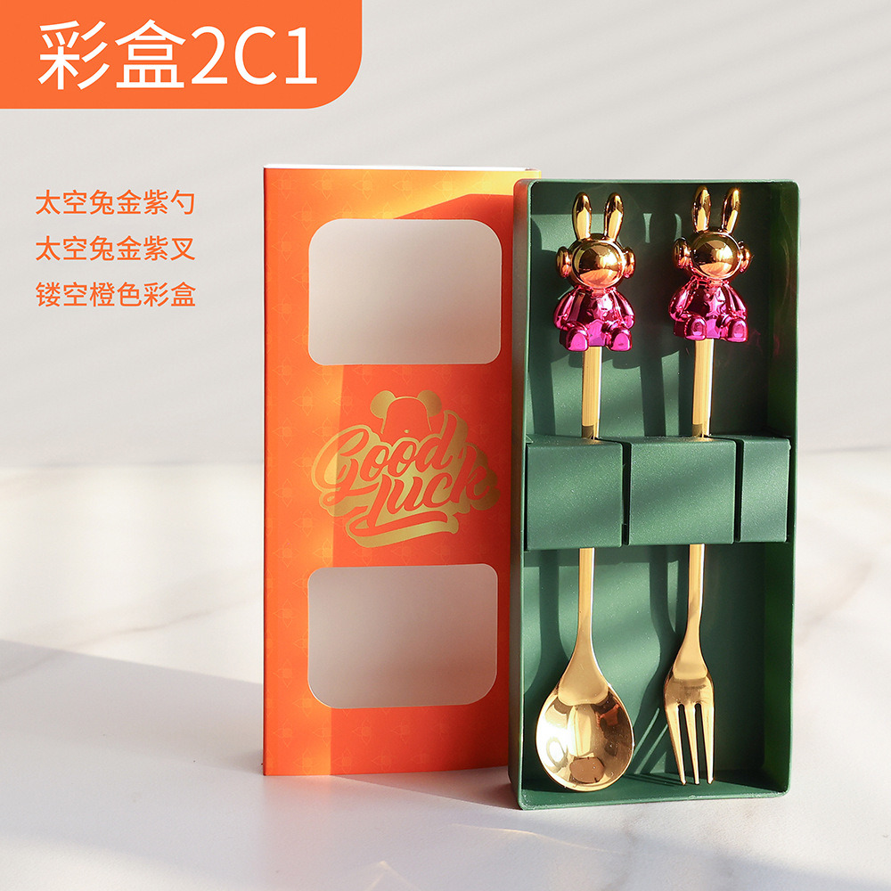 d1 black gold space rabbit spoon/golden purple bear fork + color box