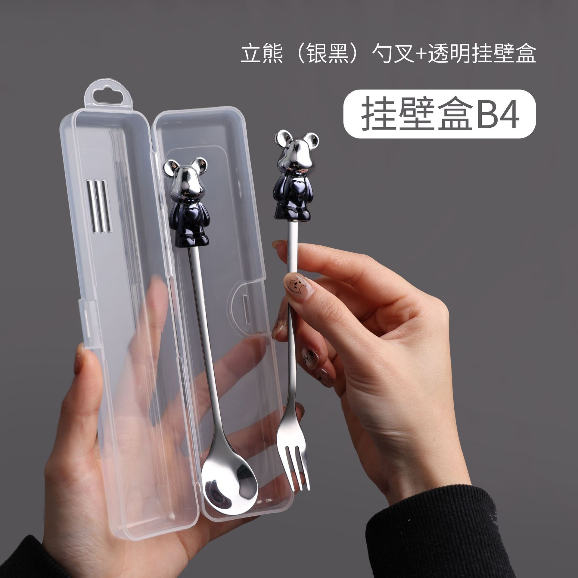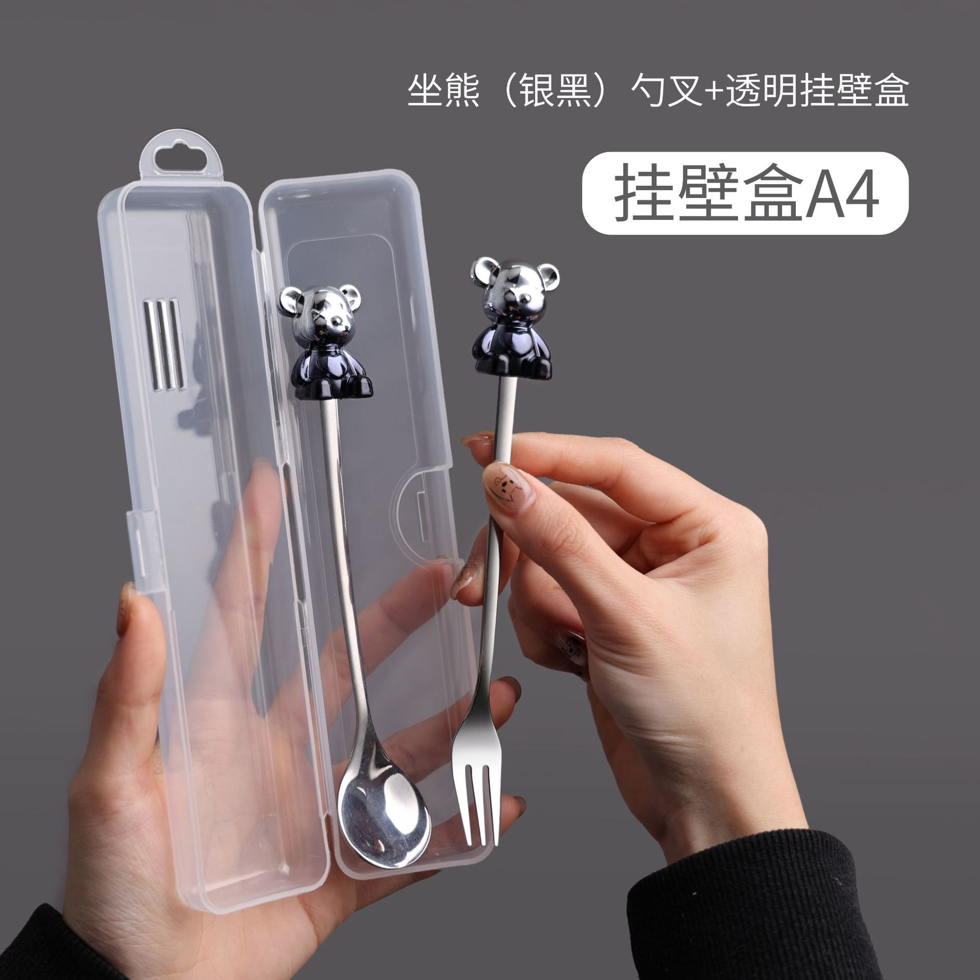 a4 silver black sitting bear spoon fork + storage box