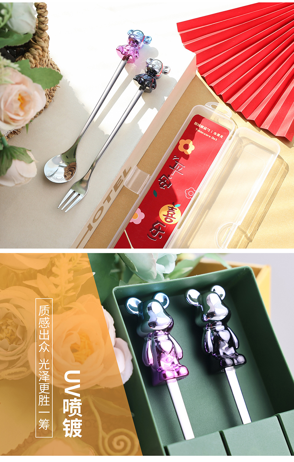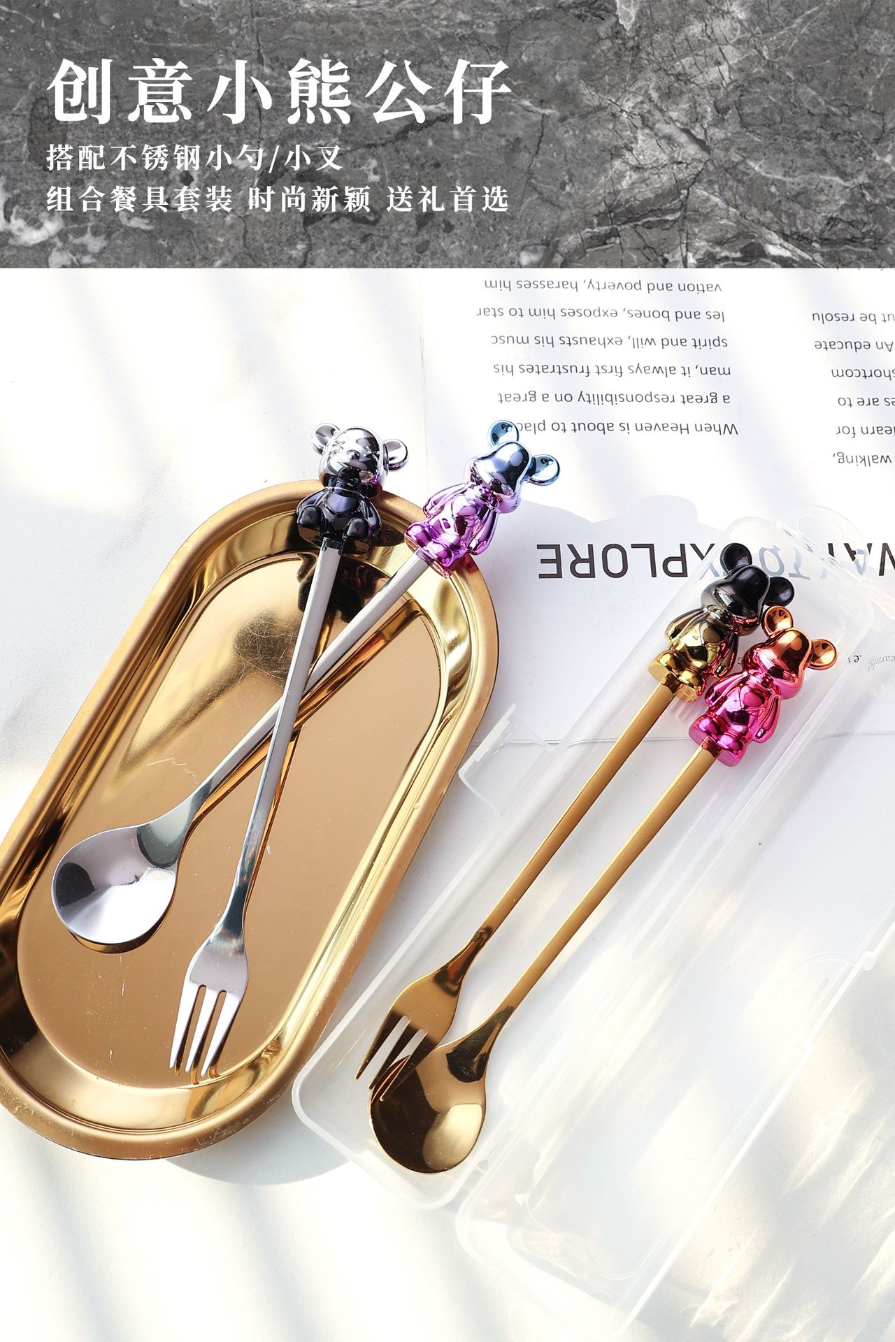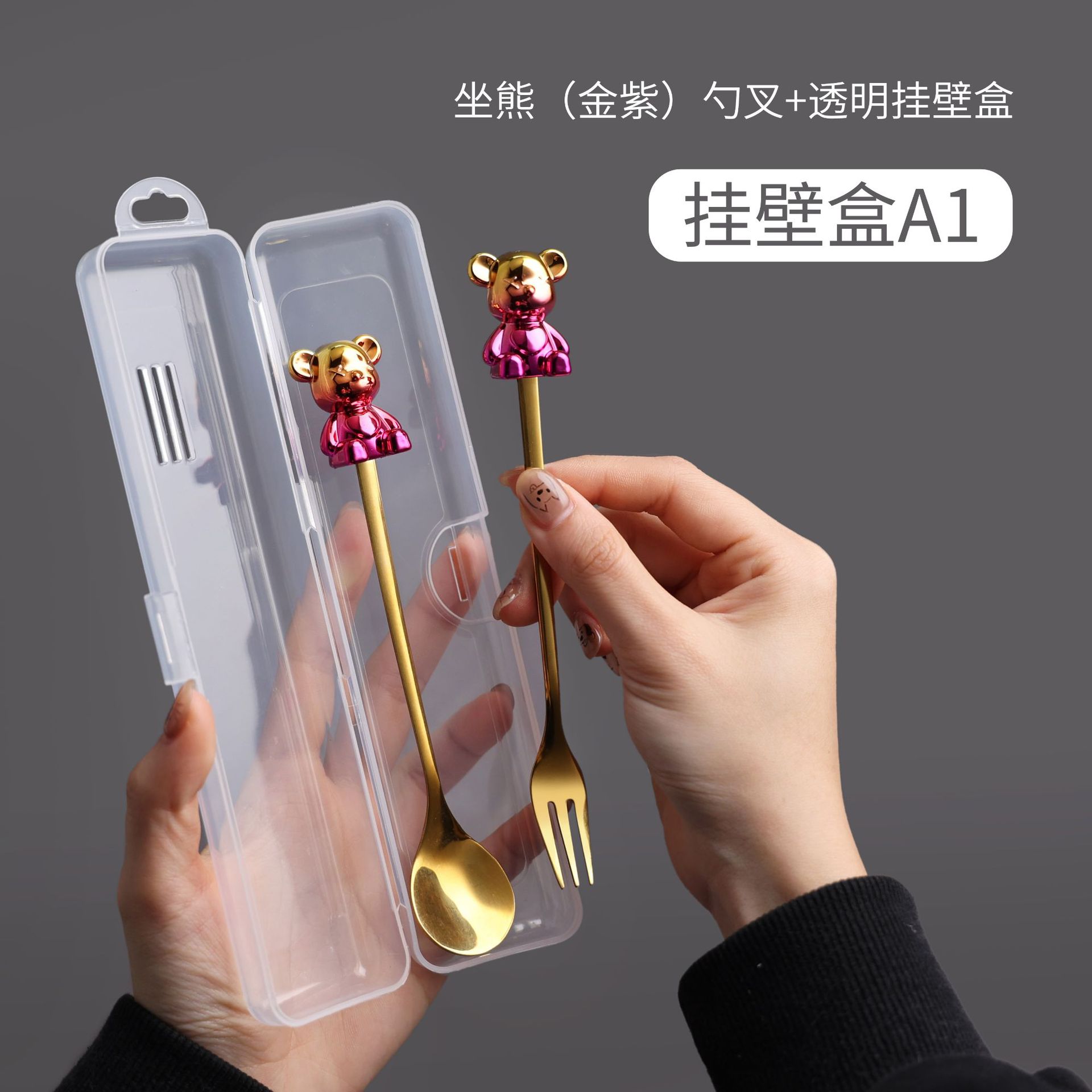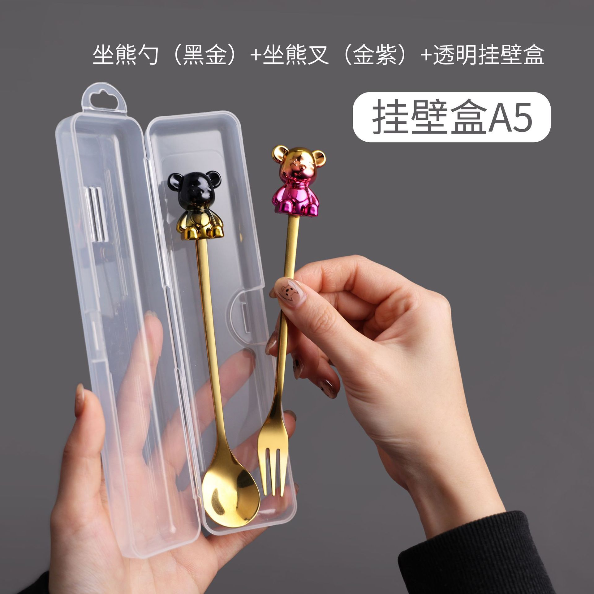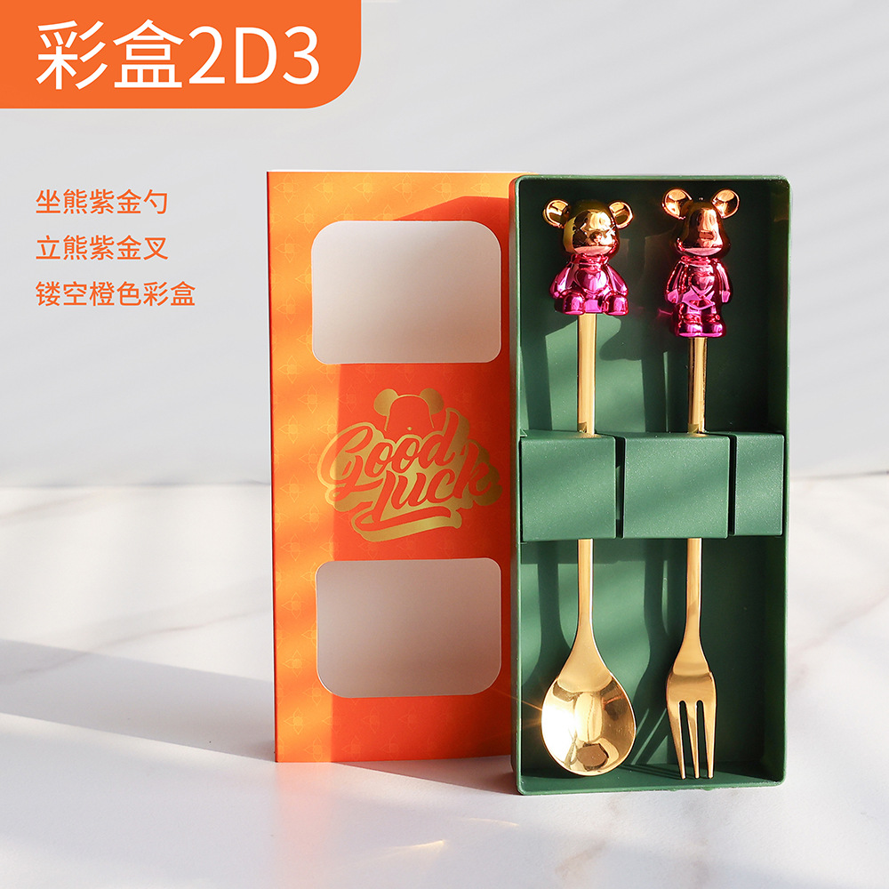 a5 black gold sitting bear spoon/gold purple sitting bear fork + storage box