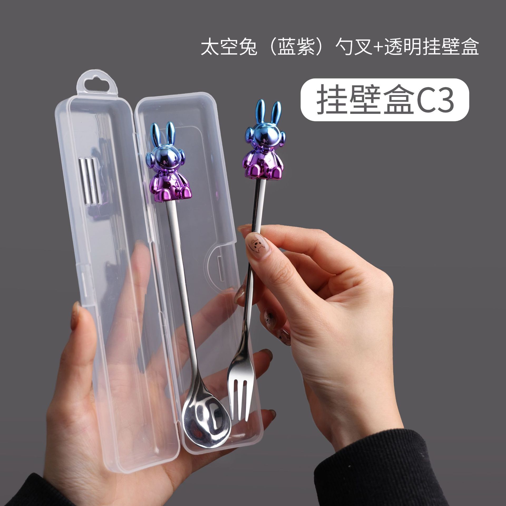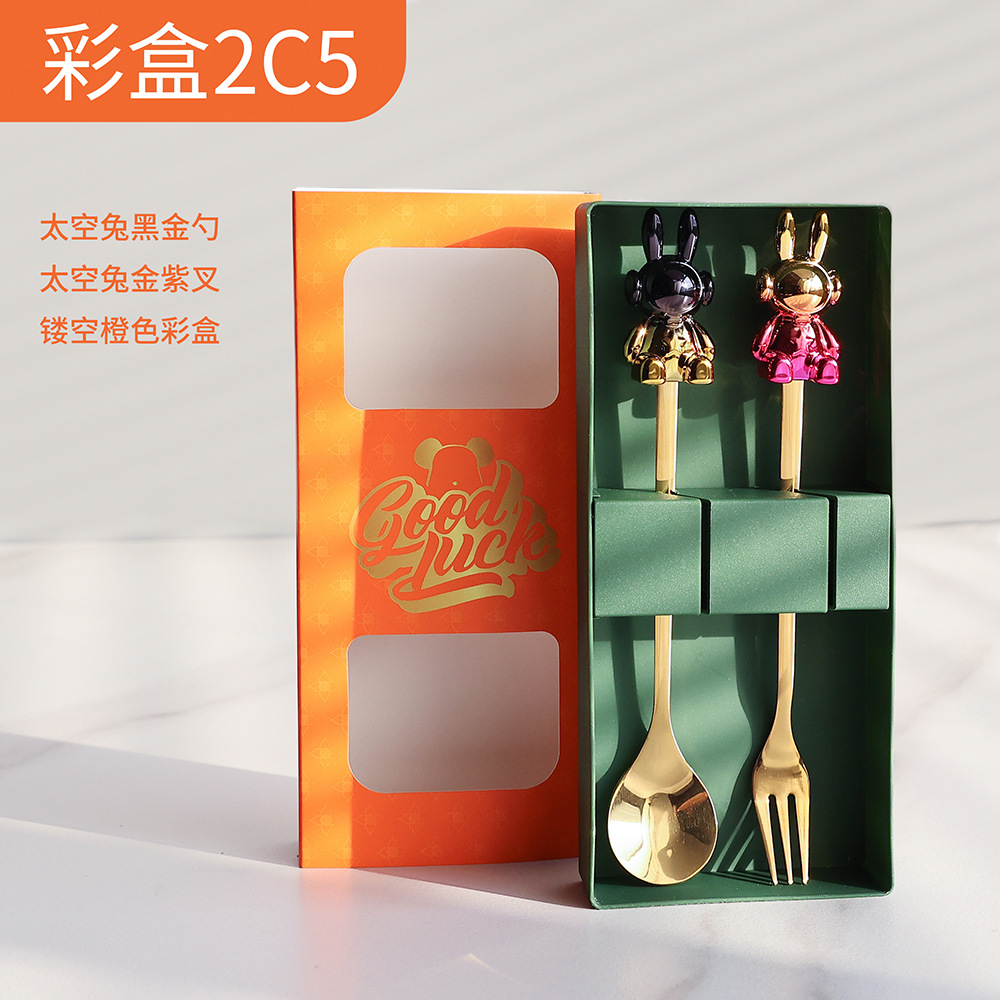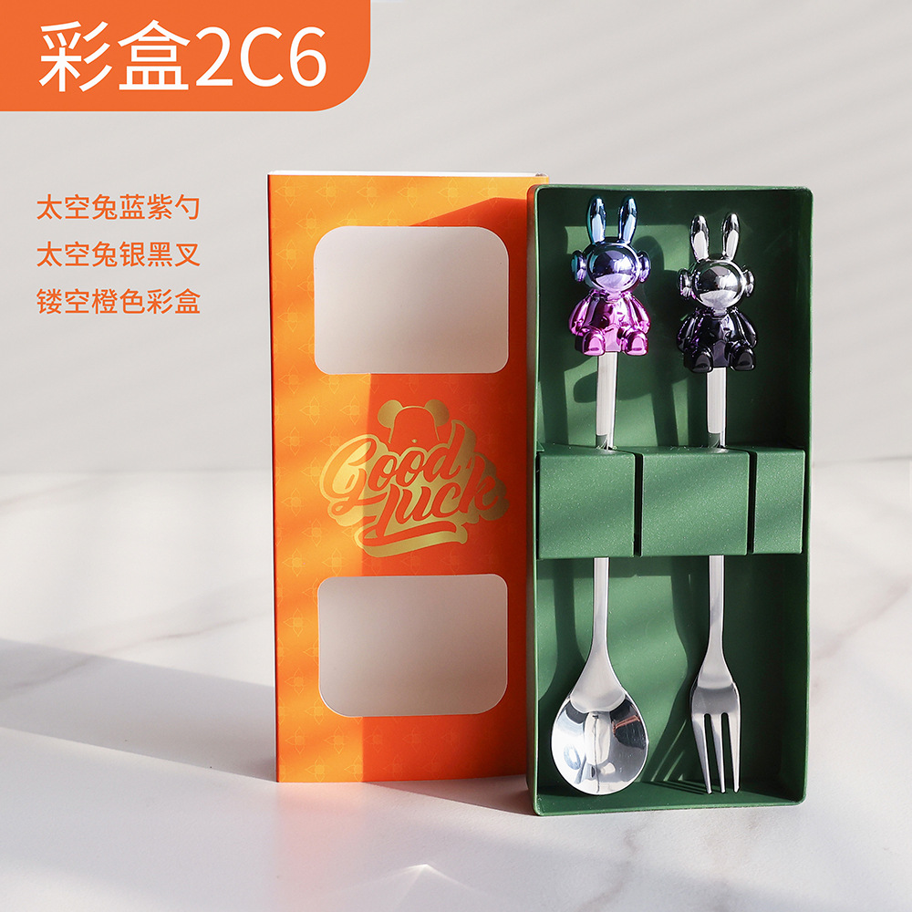 c6 blue purple space rabbit spoon/silver black space rabbit fork + color box