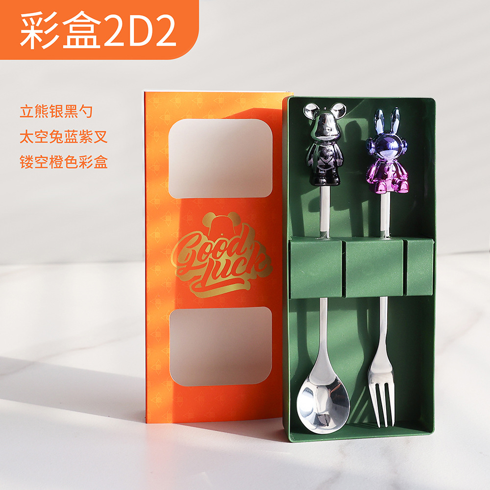 d2 silver black bear spoon/blue purple space rabbit fork + storage box