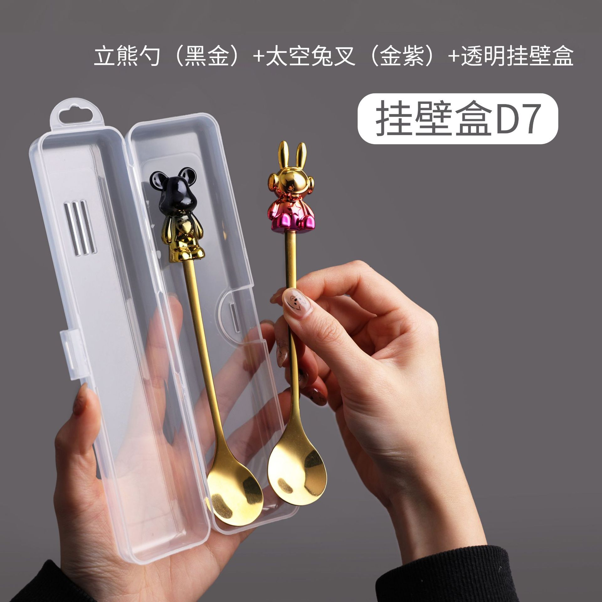 d1 black gold space rabbit spoon/gold purple bear fork + storage box