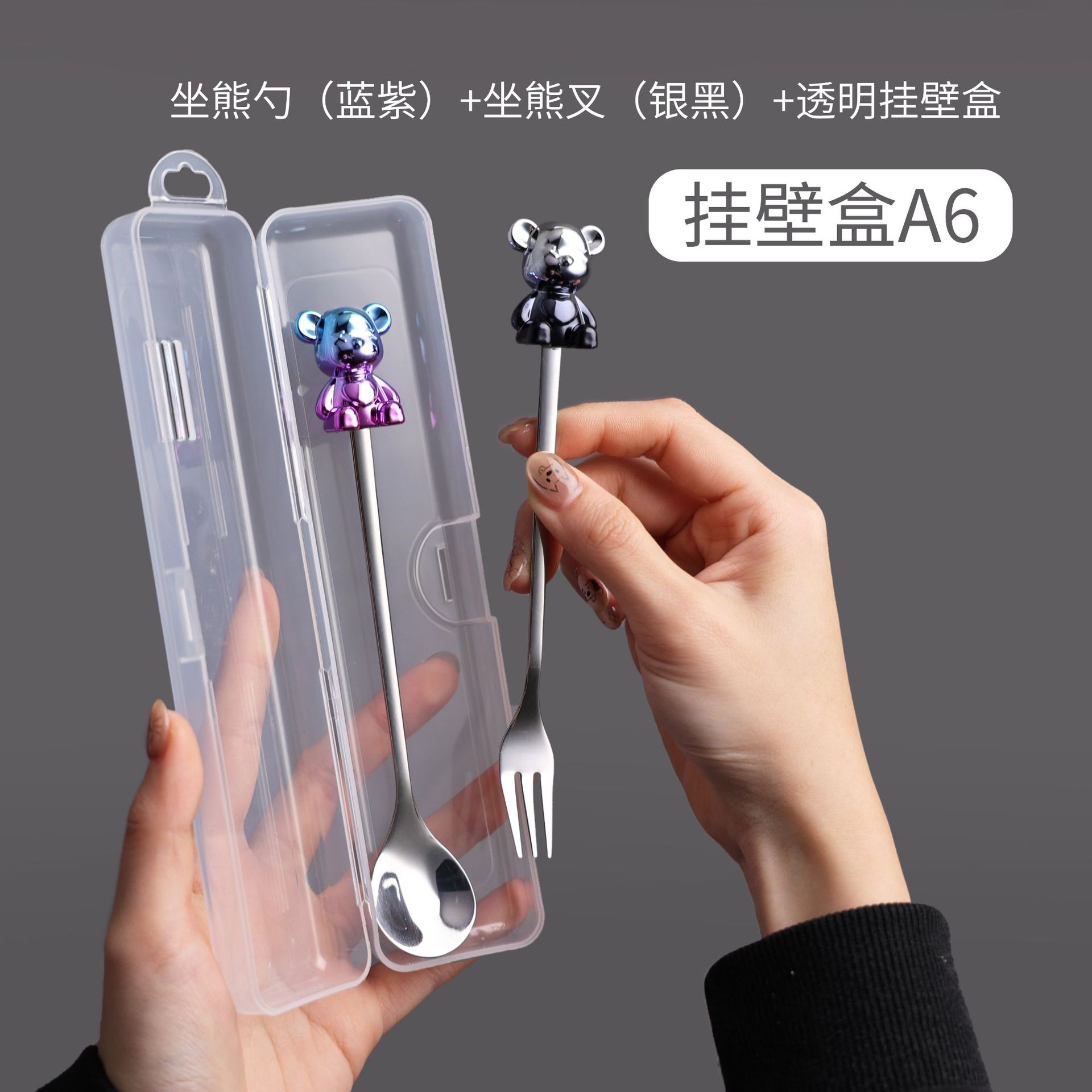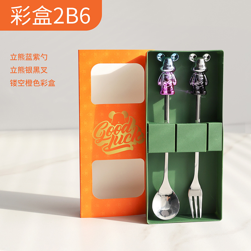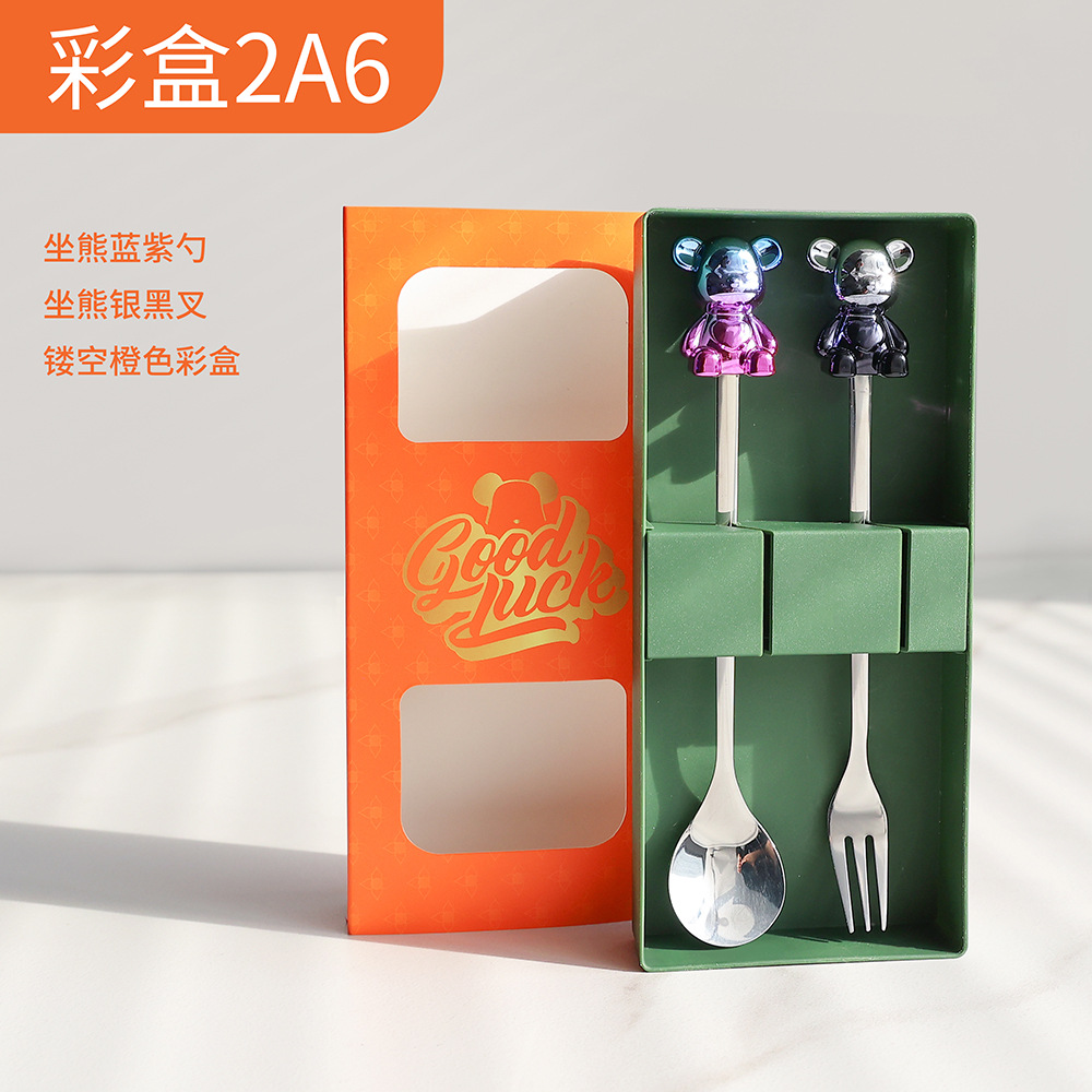 a6 blue purple sitting bear spoon/silver black sitting bear fork + storage box