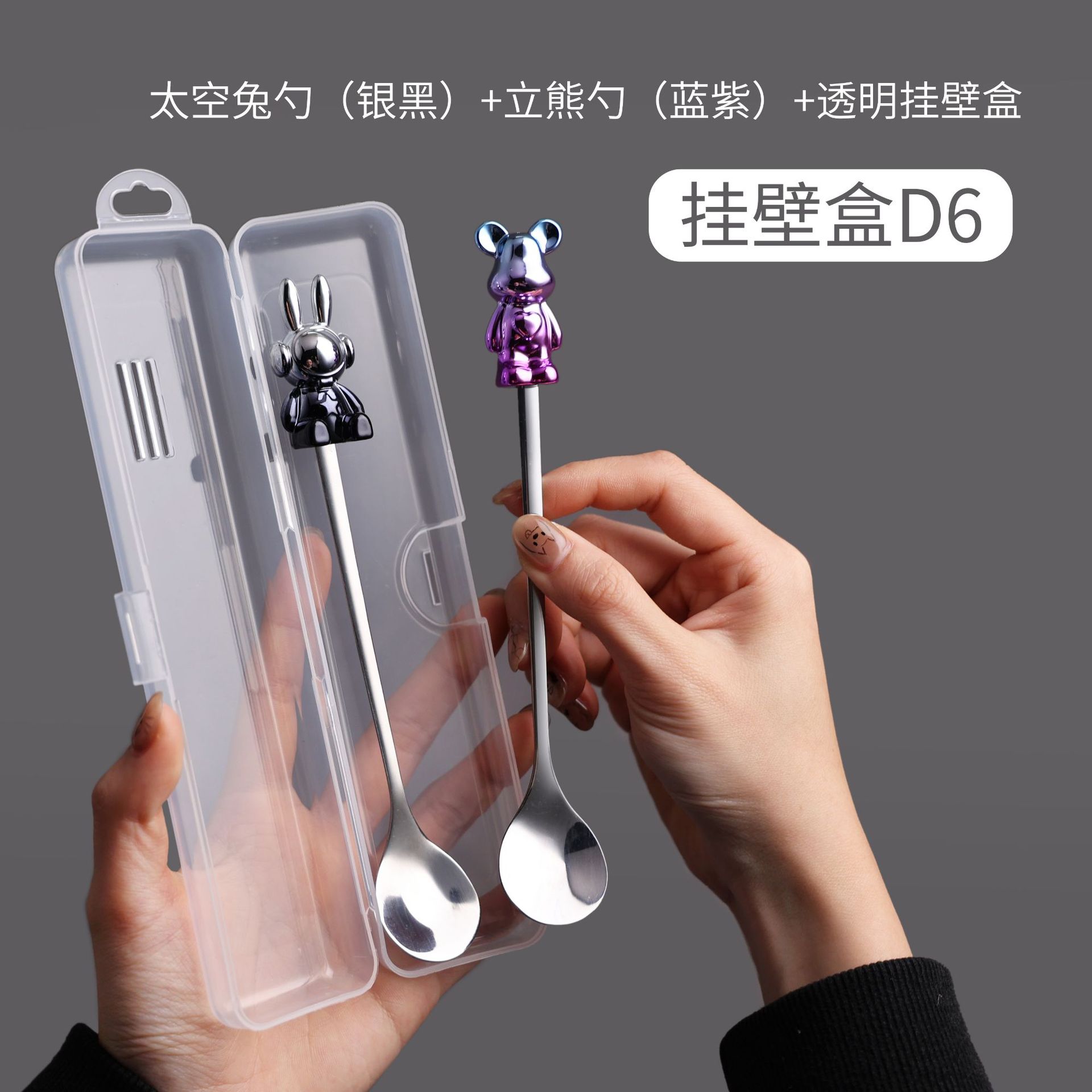 d6 silver black space rabbit spoon/blue purple bear spoon + storage box