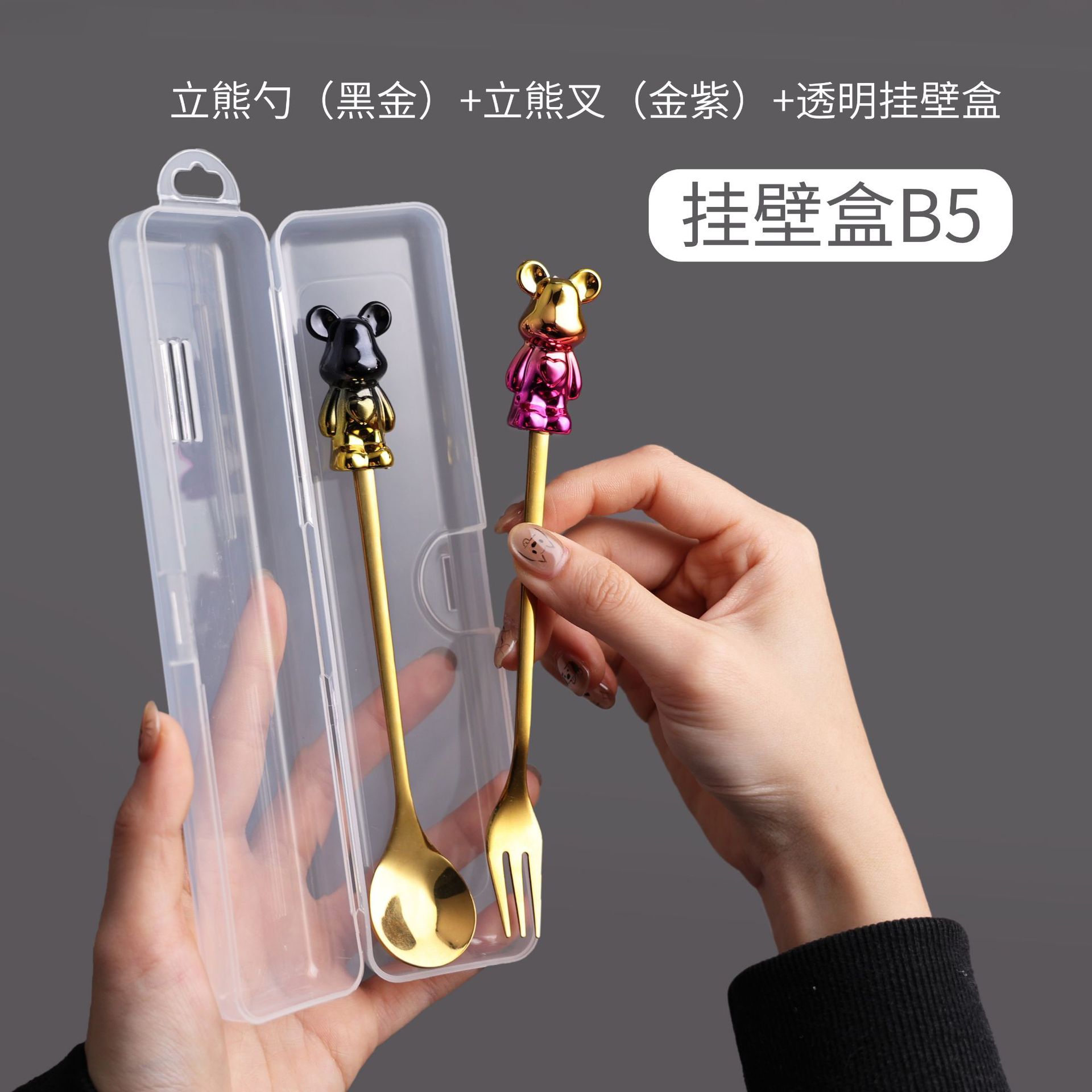 b5 black gold bear spoon/gold purple bear fork + storage box