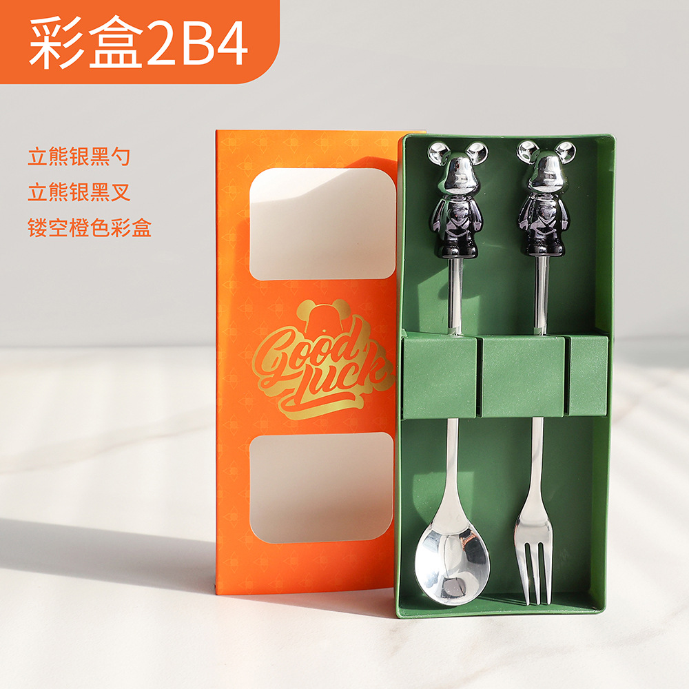 a4 silver black sitting bear spoon fork + color box