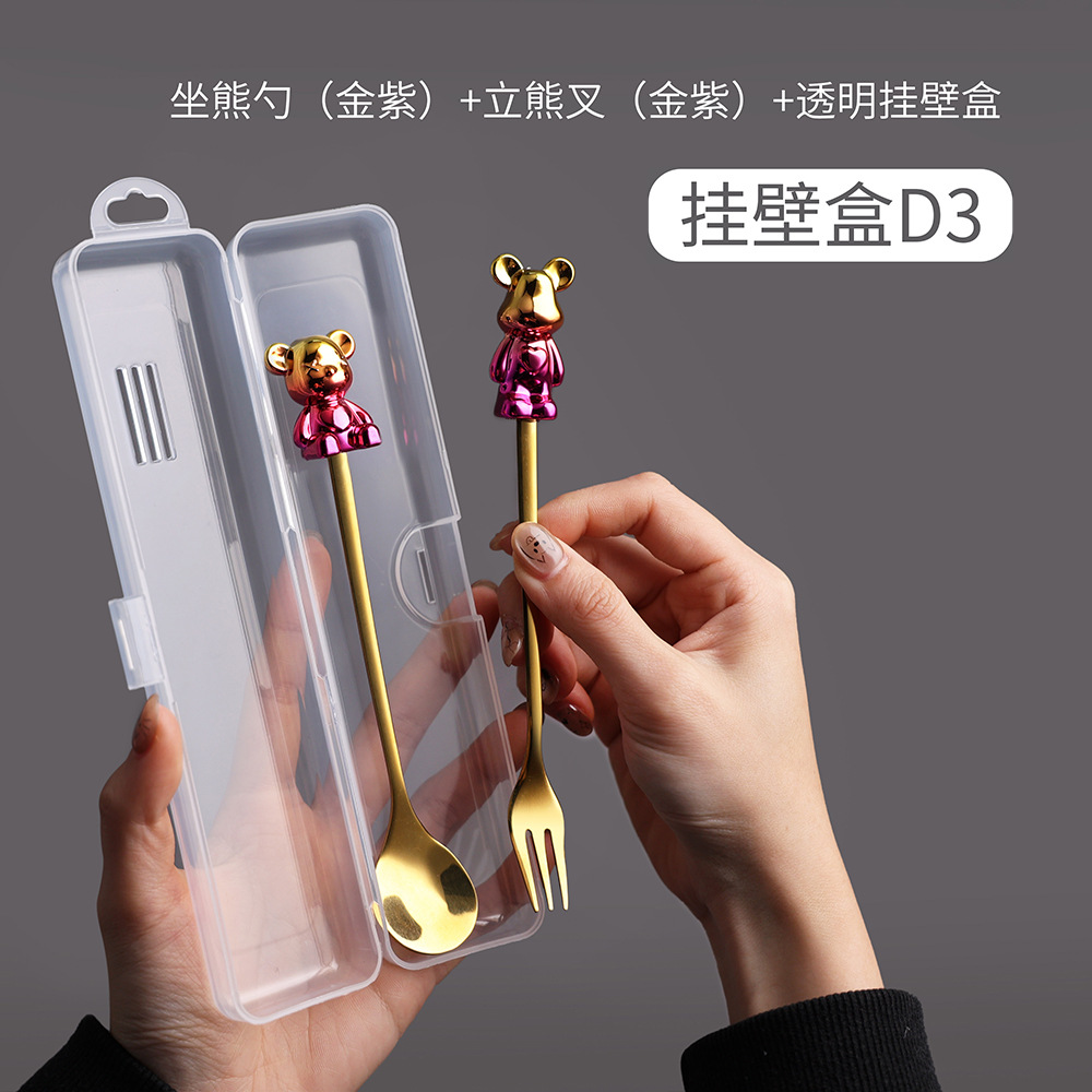 d4 blue purple bear spoon/silver black bear fork + storage box