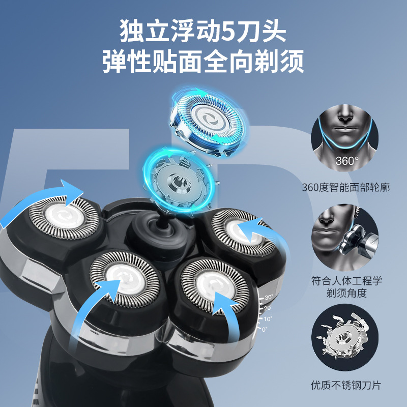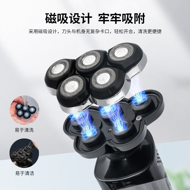 Selling Points: Magnetic Attachment Blade Design, LCD Display, Charging Base Included, Large Capacity Lithium-Ion Battery, Intelligent Anti-Pinch Feature, IPX5 Water-Resistant, Five-Blade Arc-Shaped Head, Plug-and-Play, Long-Lasting Battery Life