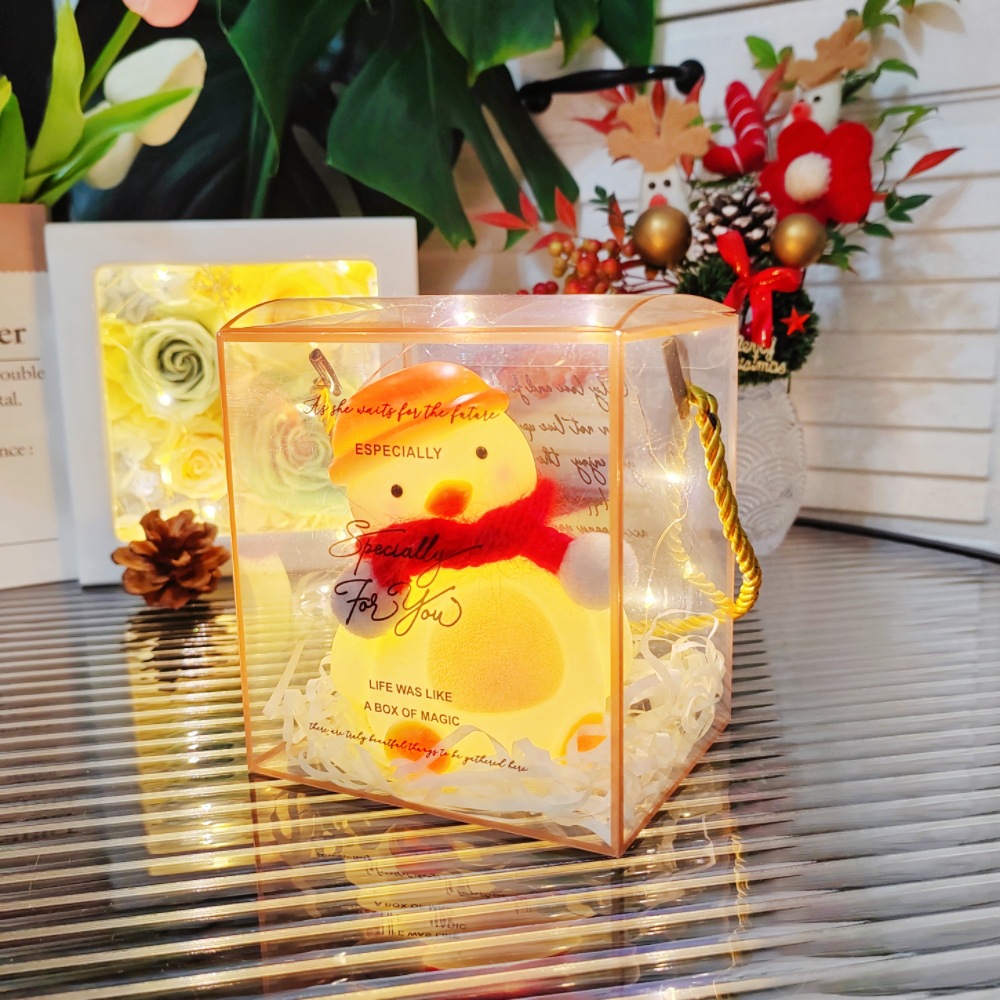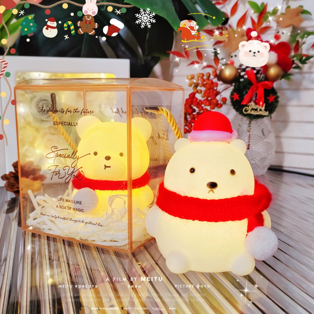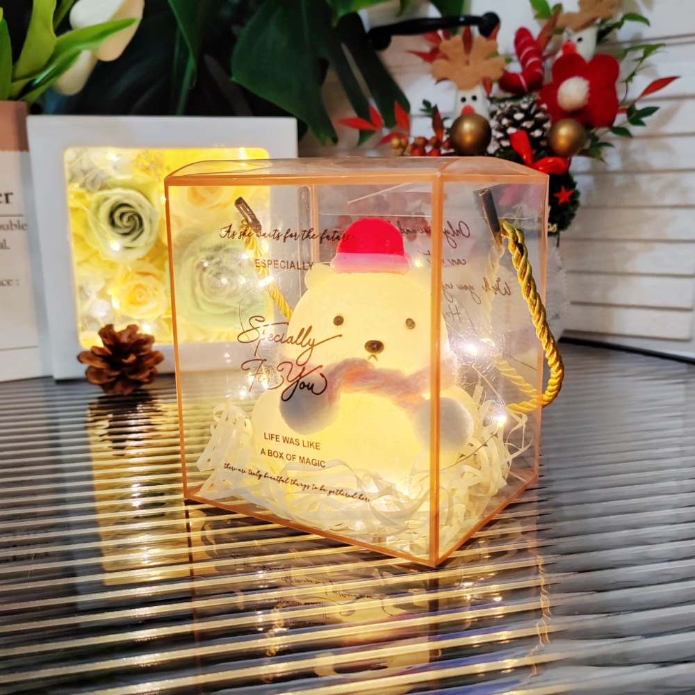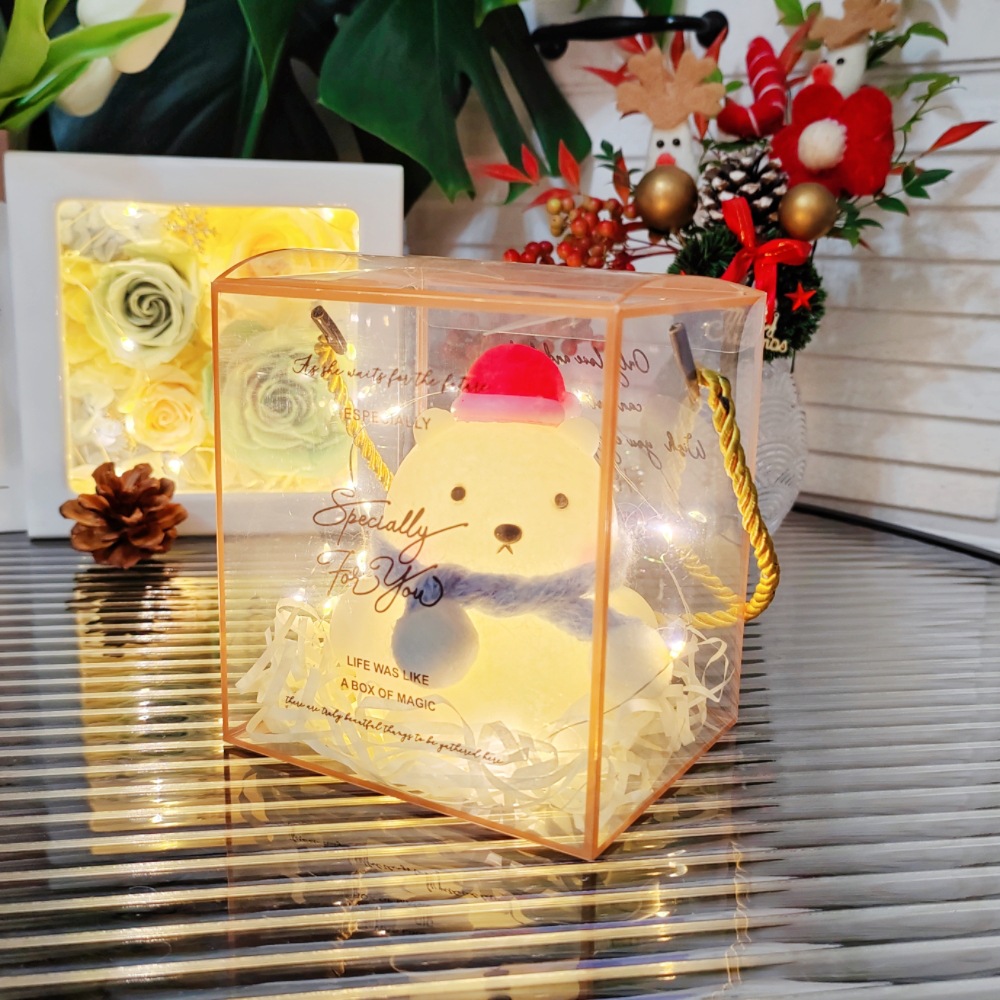 bear/red scarf + hat + square box/raffia