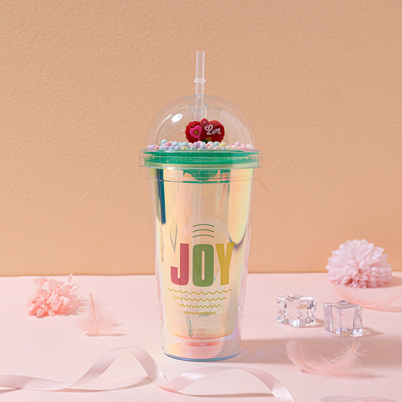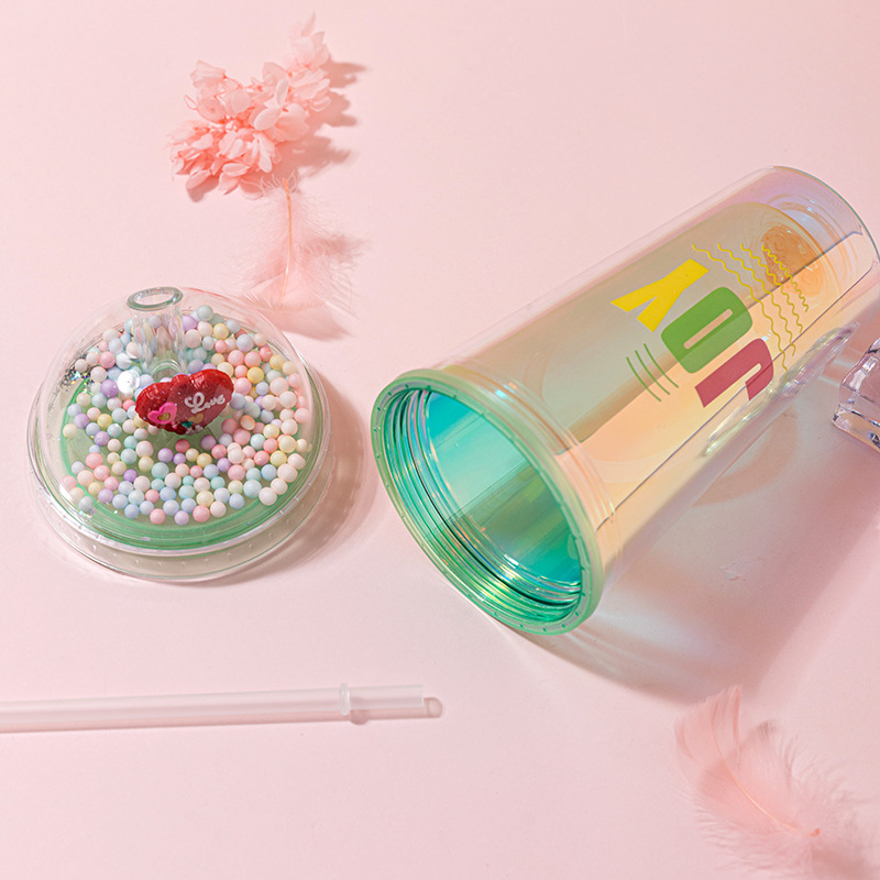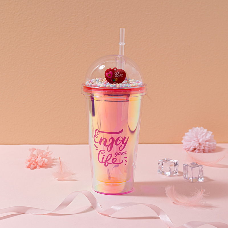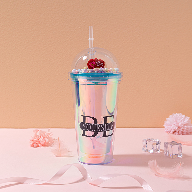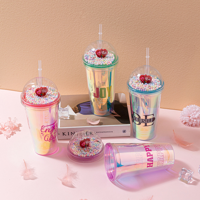 foreign trade new couple cup with straw creative laser english double-layer plastic cup internet celebrity landscape cup crushed ice cup