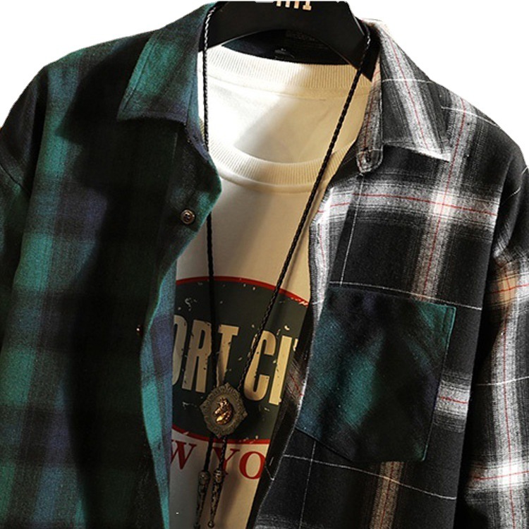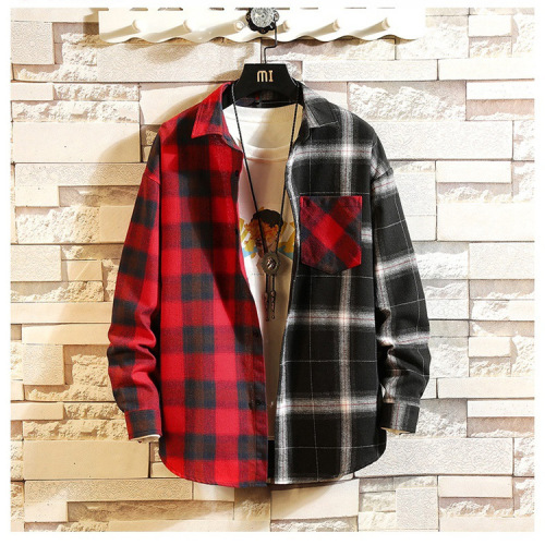 autumn and winter new flannel plaid shirt red and black plaid stitching contrast color cotton shirt men's long sleeve shirt 中文版
