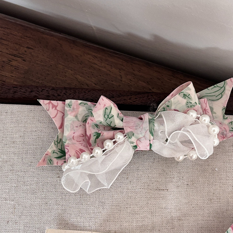 1# white bow pink floral ribbon hairpin