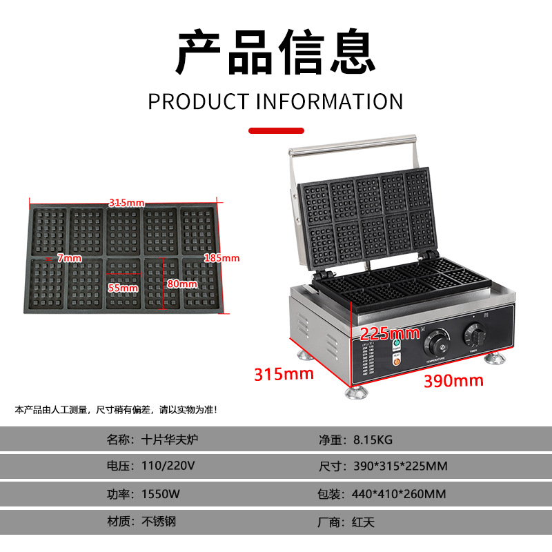 commercial electric ten-grid waffle oven square square square double-sided sandwich muffin machine ten pieces square waffle furnace 中文版