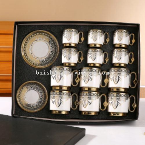 New Coffee Cup and Saucer Set - 12 cups and 12 saucers. Gold-plated coffee cup and saucer set with 6 large and 6 small cups and saucers per box, 12 sets per case. Small cups hold 90ML, large cups hold 220ML!