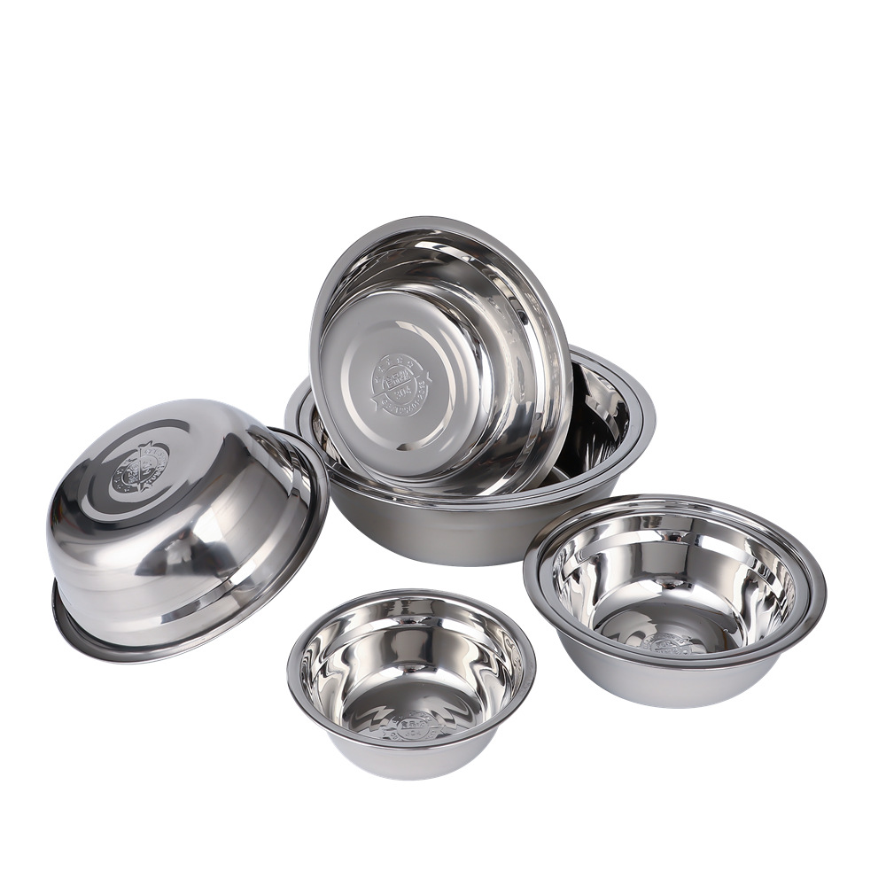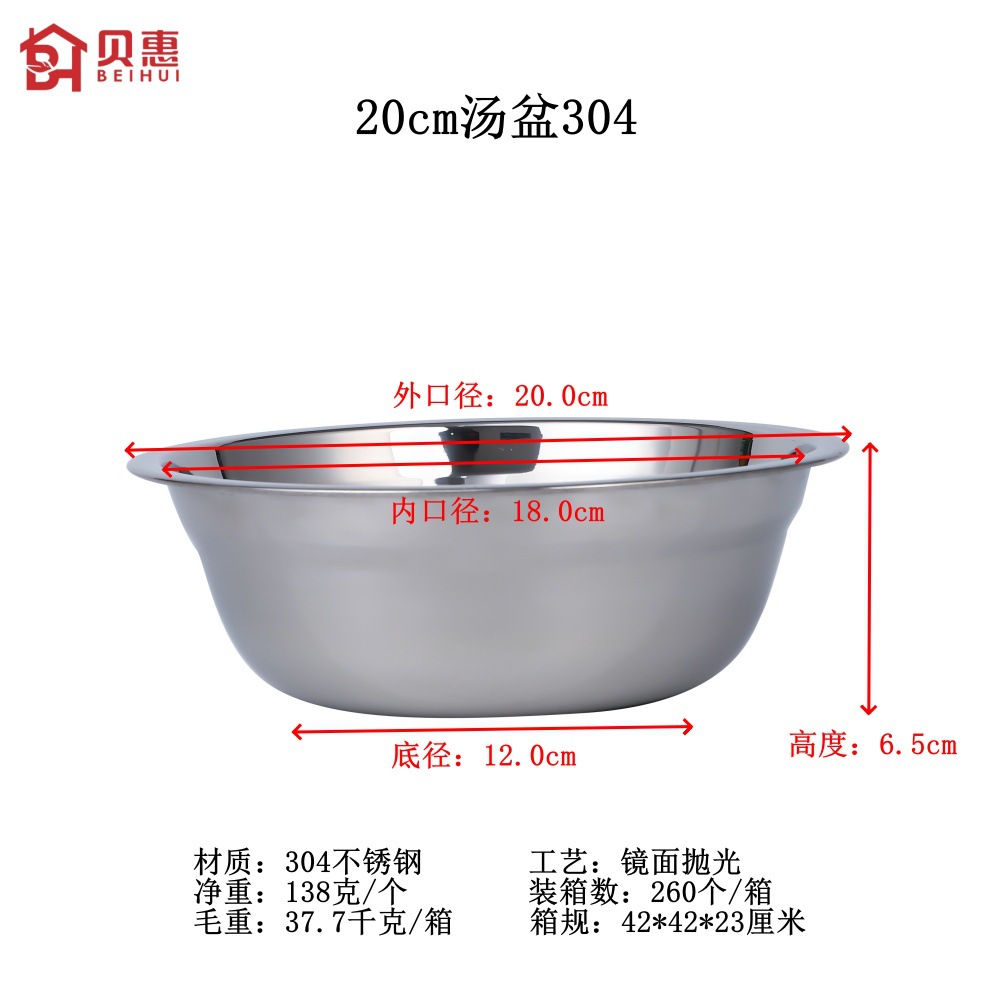 Product Name Net Weight Outer DiameterInternal diameter Base diameterHeight: 1000 units 14cm soup bowl 304 68g 14.0cm 12.3cm 8.0cm 5.0cm 500 pieces/box 16cm Soup Bowl 304, 89g, 16.0cm, 14.2cm, 9.0cm, 5.5cm, 400 pieces/box 18cm Soup Bowl 304, 113g, 18.0cm, 16.0cm, 10.0cm, 6.0cm, 300 pieces/box 20cm Soup Bowl 304, 138g, 20.0cm, 18.0cm, 12.0cm, 6.5cm, 260 pieces/box 22cm Soup Bowl 304, 162g, 22.0cm, 20.0cm, 13.0cm, 6.9cm, 200 pieces/box 24cm soup bowl 304, 205g, 24.0cm, 22.0cm, 14.5cm, 7.3cm, 180 pieces/box 26cm soup bowl 304, 233g, 26.0cm, 24.0cm, 15.5cm, 7.7cm, 160 pieces/box This data is for reference only, actual size and weight should be confirmed by the actual product!
