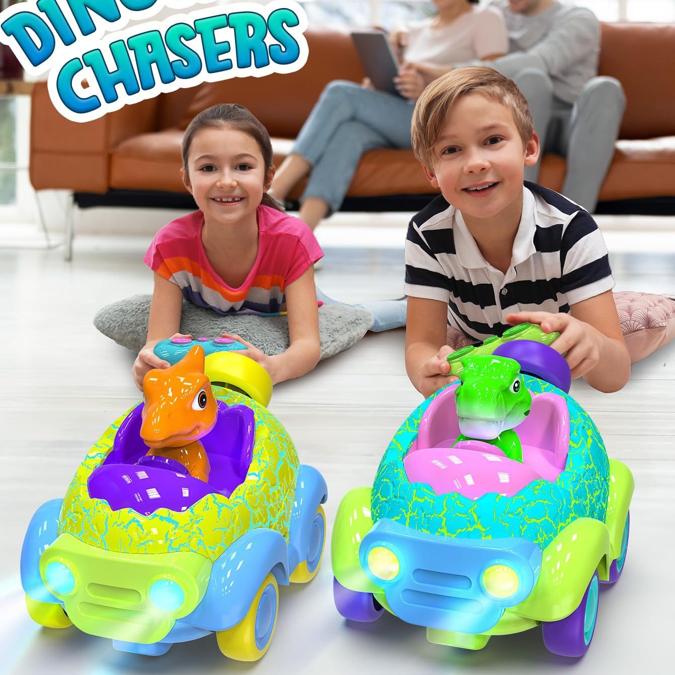Remote-controlled car * 2, dinosaur plush * 2, remote control * 2, USB charging cable * 1,