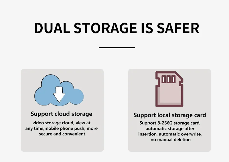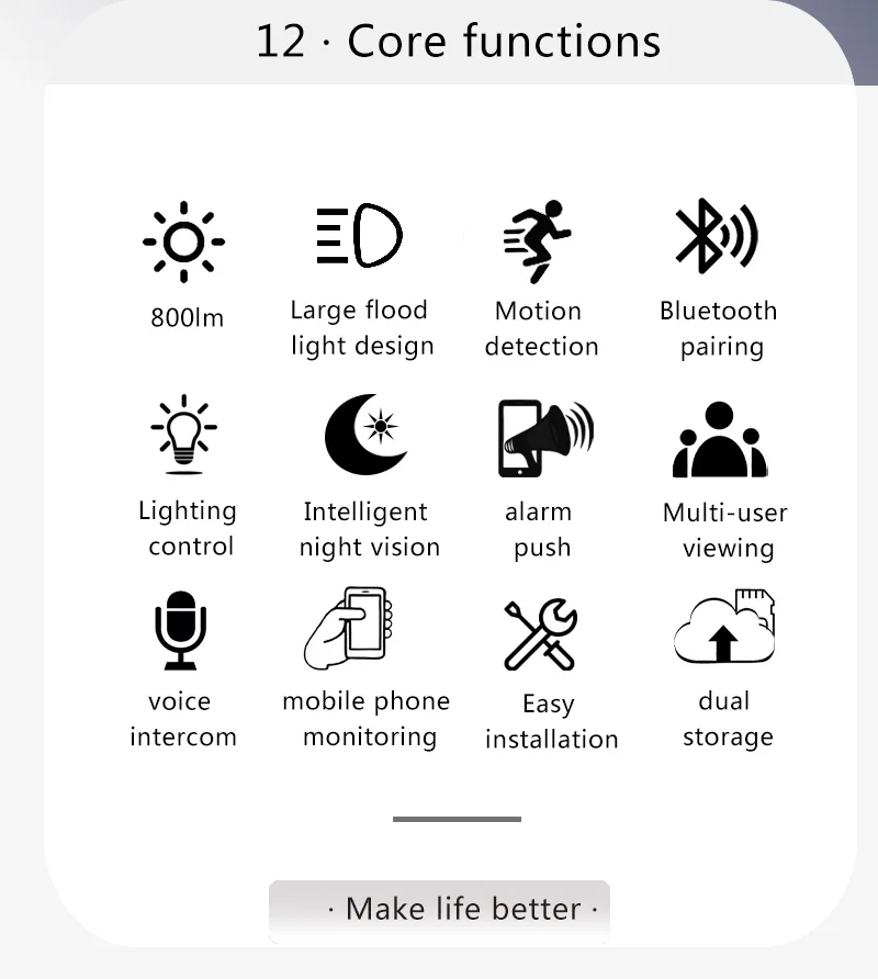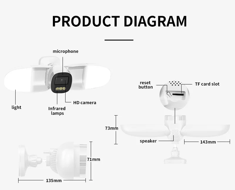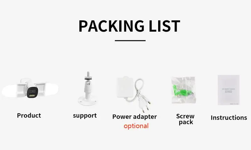 800LM Support ONVIF Support Push notification for APP Support Digital Zoom Support Two Way Audio Support max 128G TF card (extra cost) Support Cloud Storage(Extra cost) Support 2.4G WiFi Support mobile video surveillance (iOS, Android) Support Outdoor use waterproof Power Supply: DC 12V(Extra cost) |